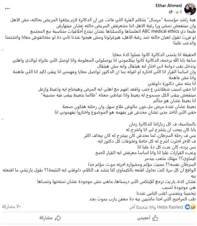 وكتبت إيثار :" هبة راشد مؤسسة "مرسال" بتتكلم الفترة اللي فاتت عن إن الدكاترة لازم يبلغوا المريض بحالته مش الأهل، وإن مينفعش نمشي ورا رغبة الأهل إننا مننعرفش المريض حالته عشان مينهارش، طبعًا دي ABC medical ethics اتعلمناها وكنسلناها عشان نبتدع أخلاقيات متناسبة مع المجتمع".