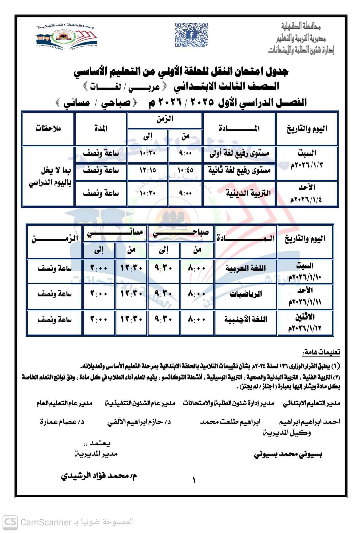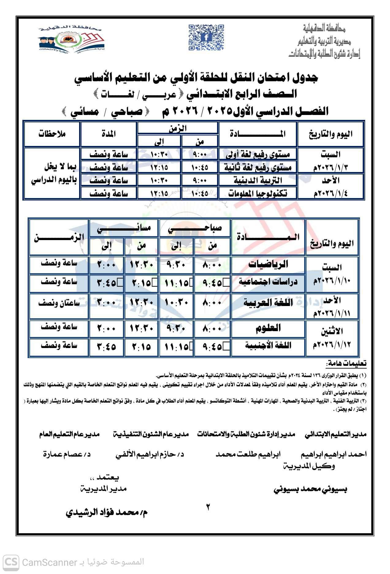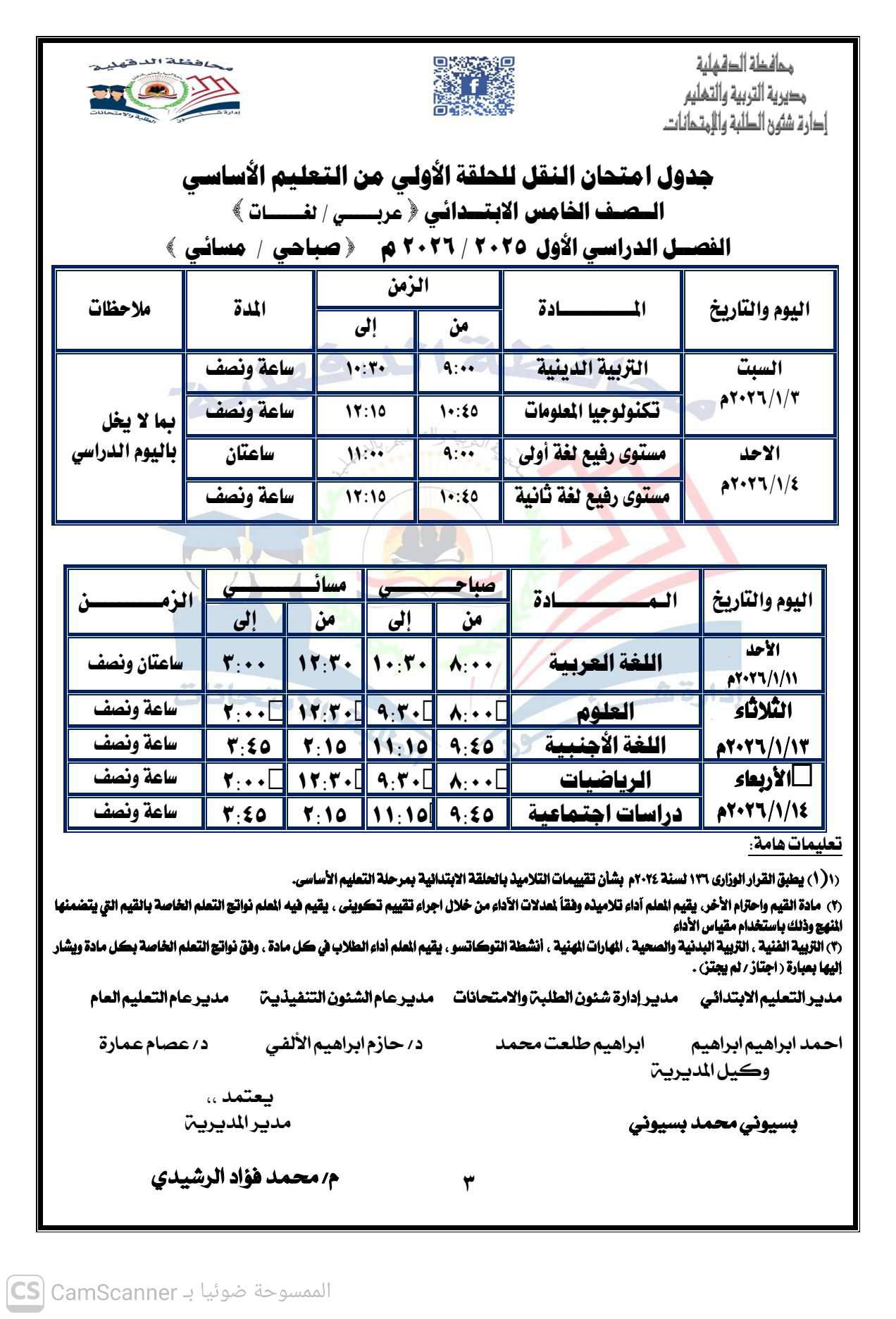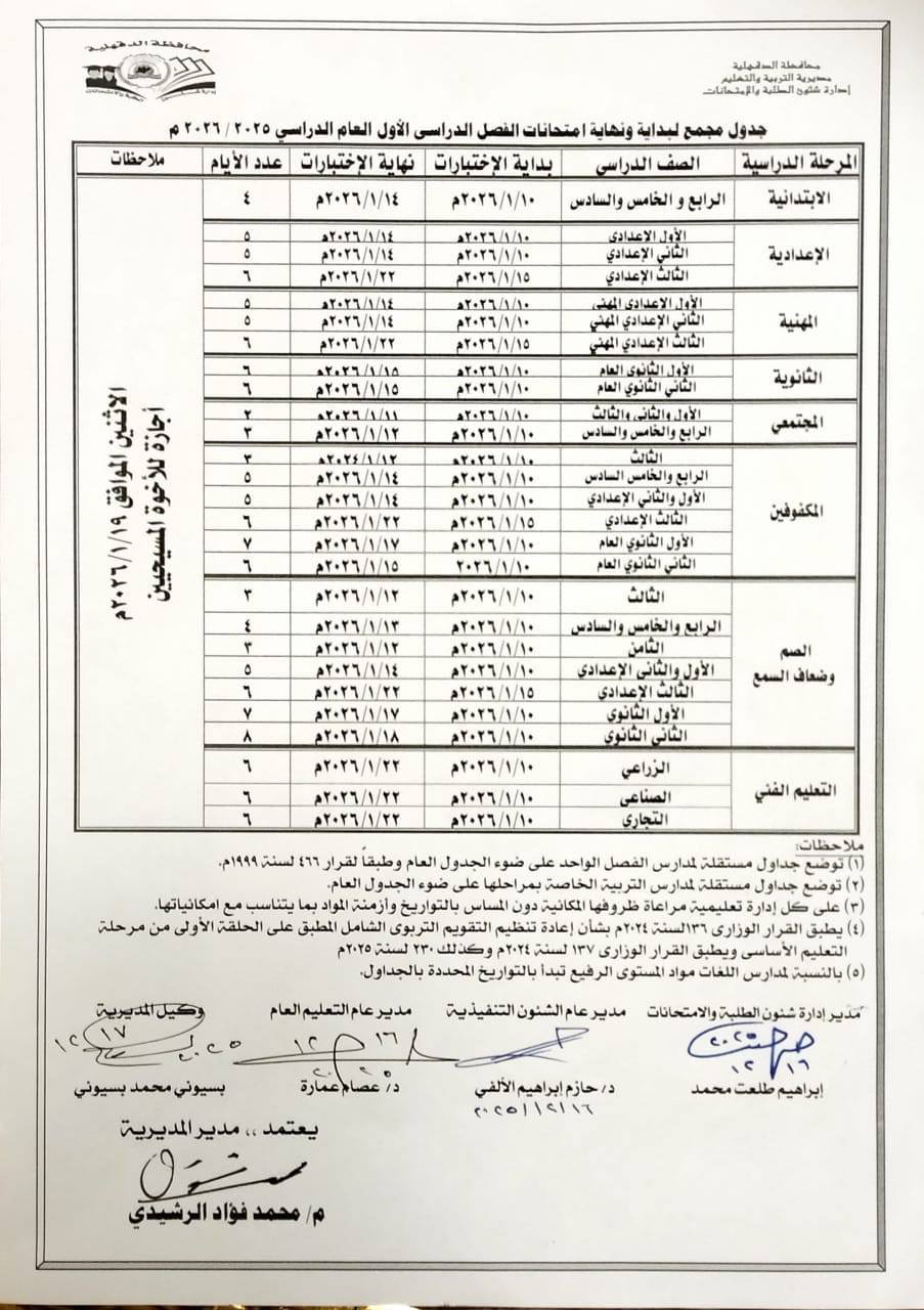 جدول امتحانات نصف العام محافظة الدقهلية لجميع المراحل الدراسية 2026