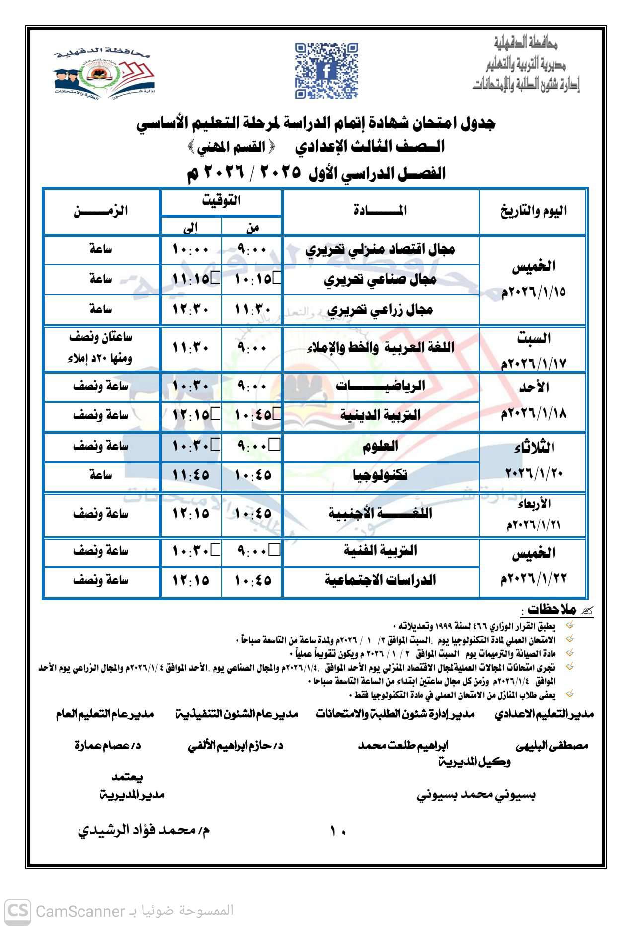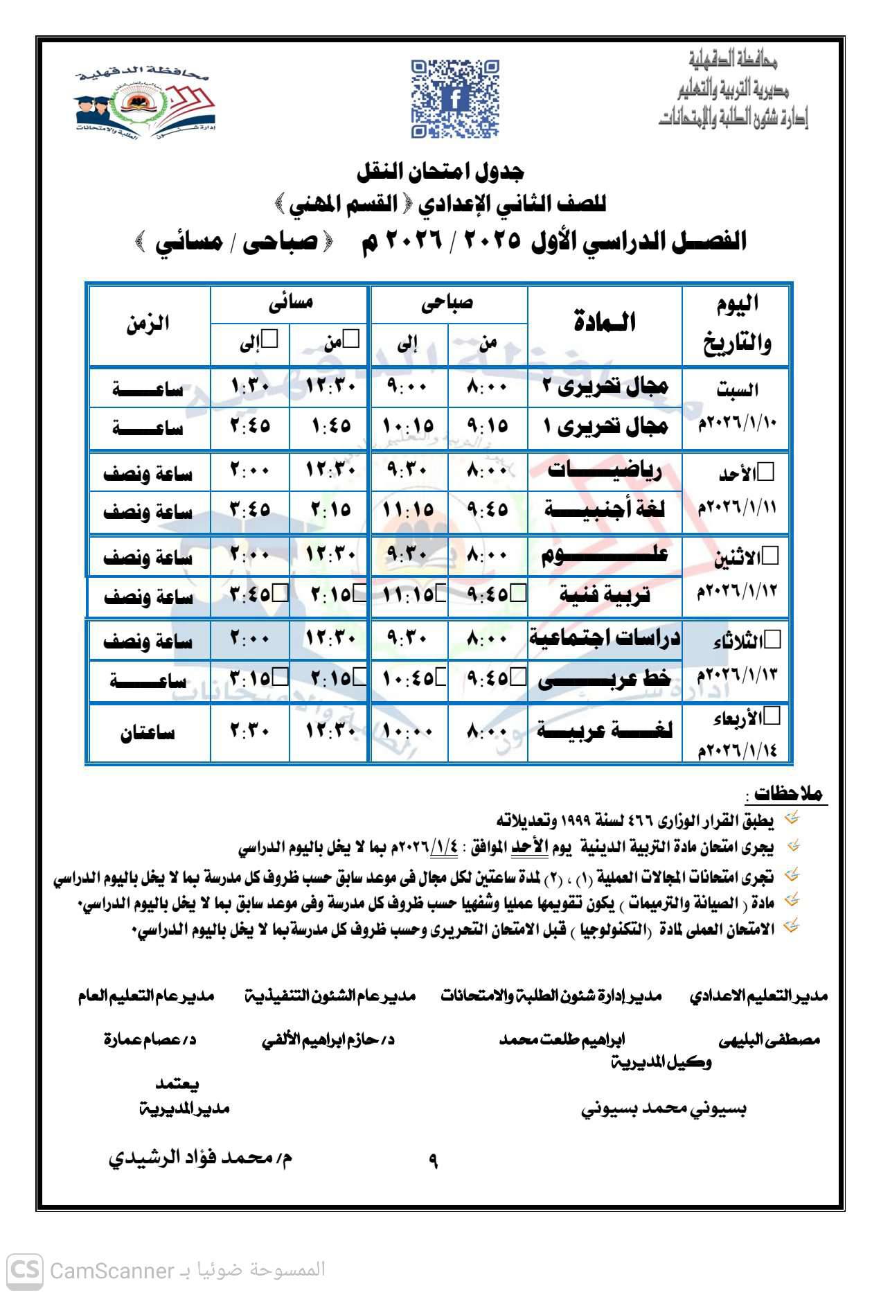 جدول امتحانات نصف العام للصف الثالث الإعدادي محافظة الدقهلية 2026