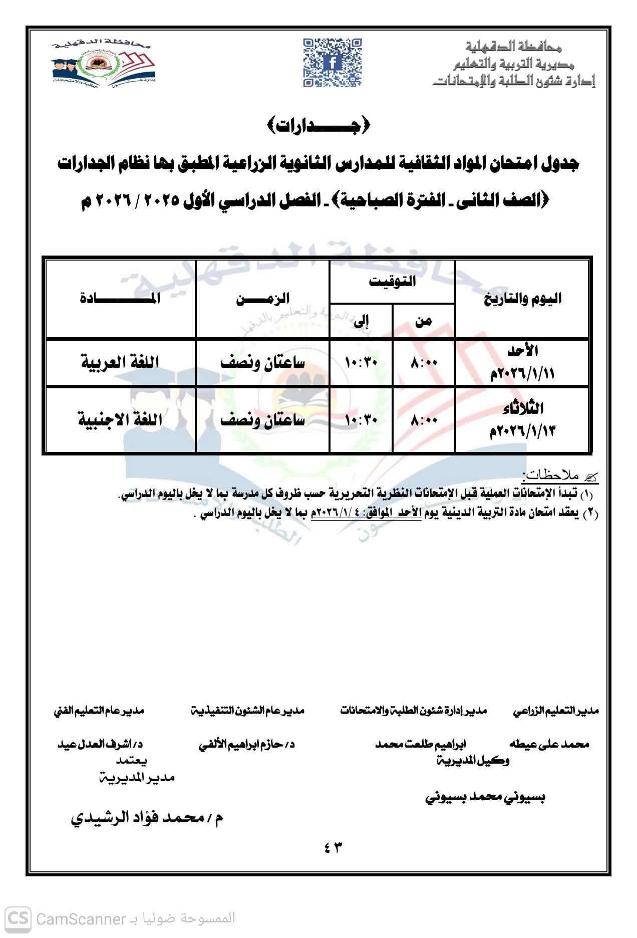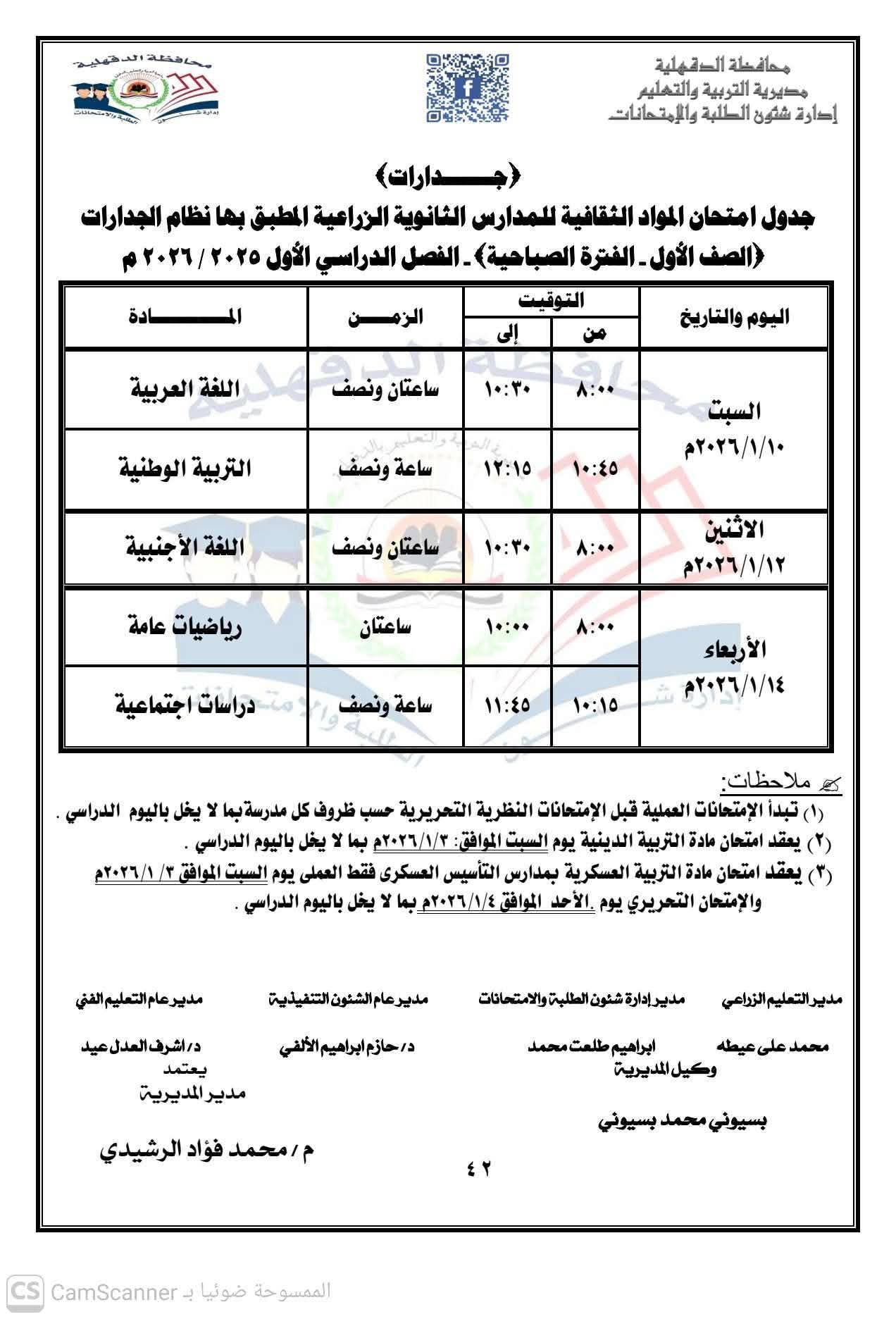 جدول امتحانات المواد الثقافية للمدارس الثانوية الزراعية بالدقهلية 2025-2026