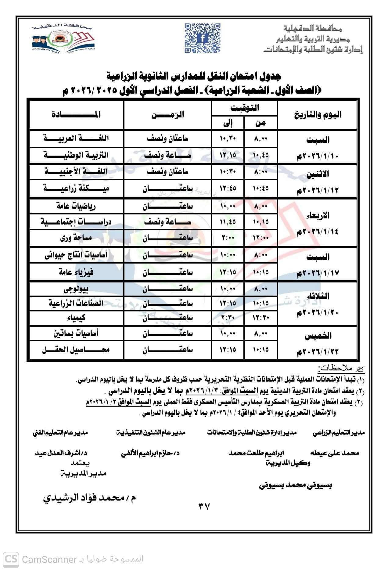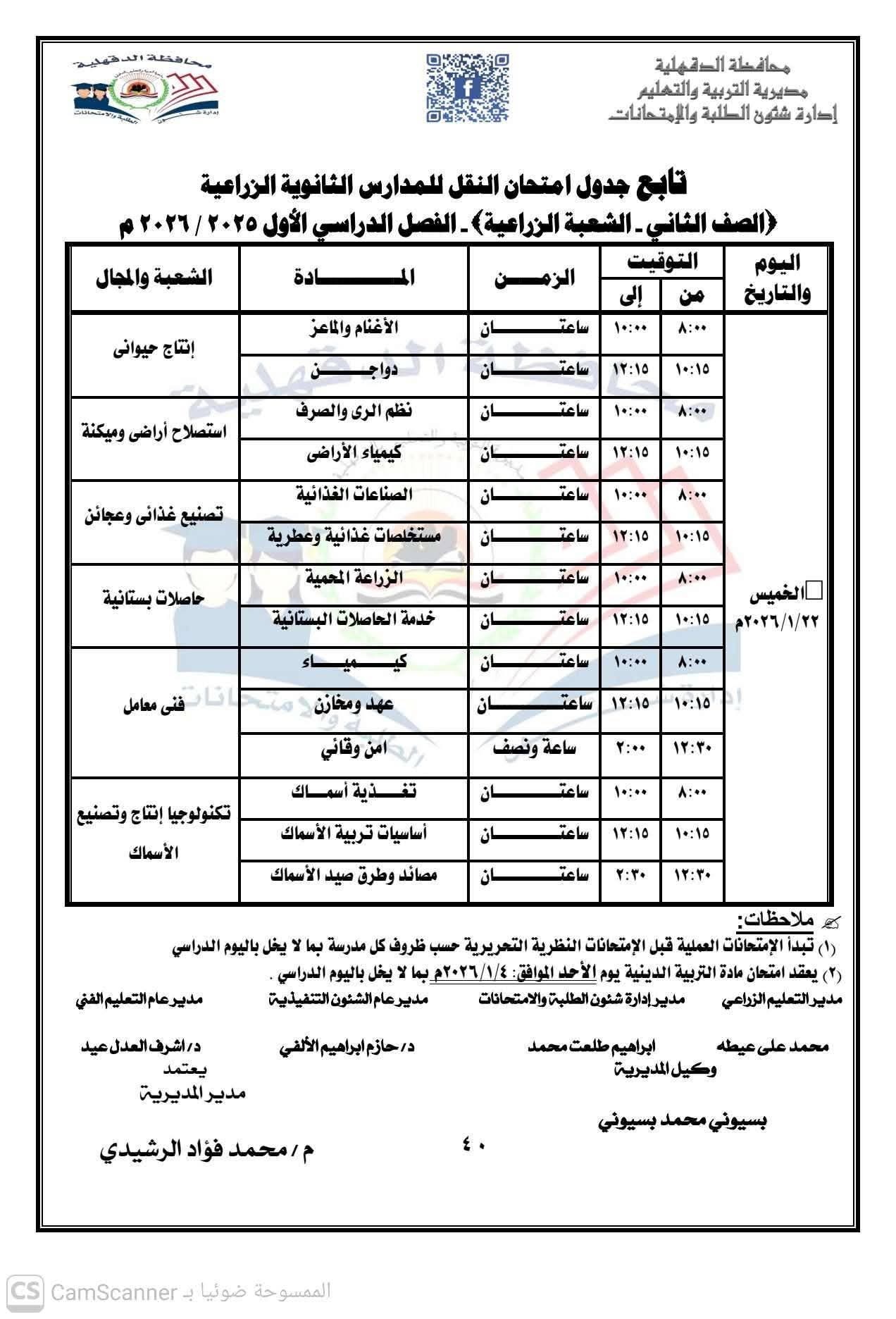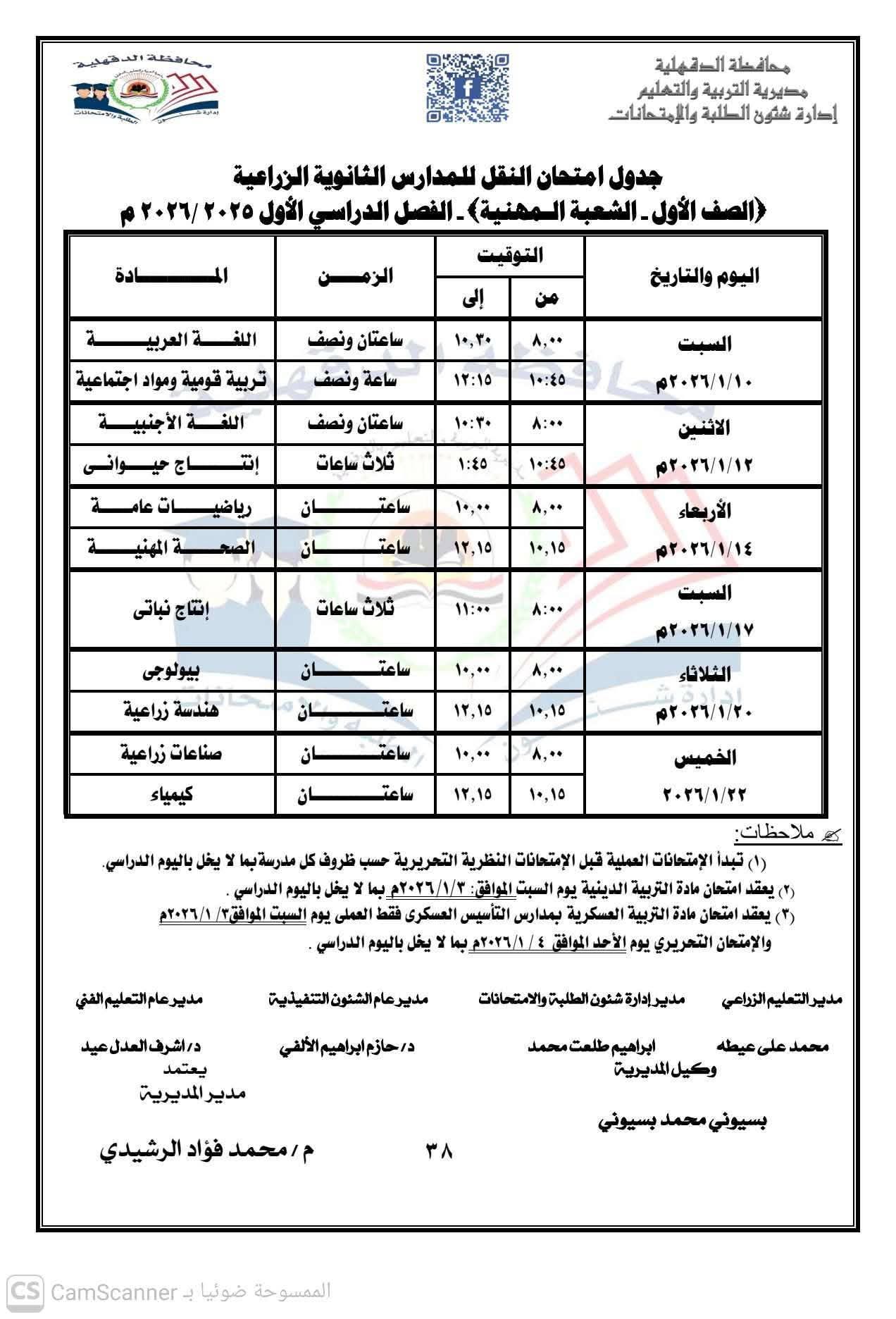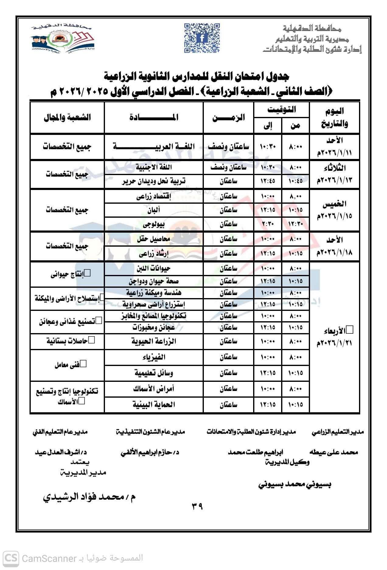 جدول امتحان النقل للمدارس الثانوية الزراعية بالدقهلية 2025-2026