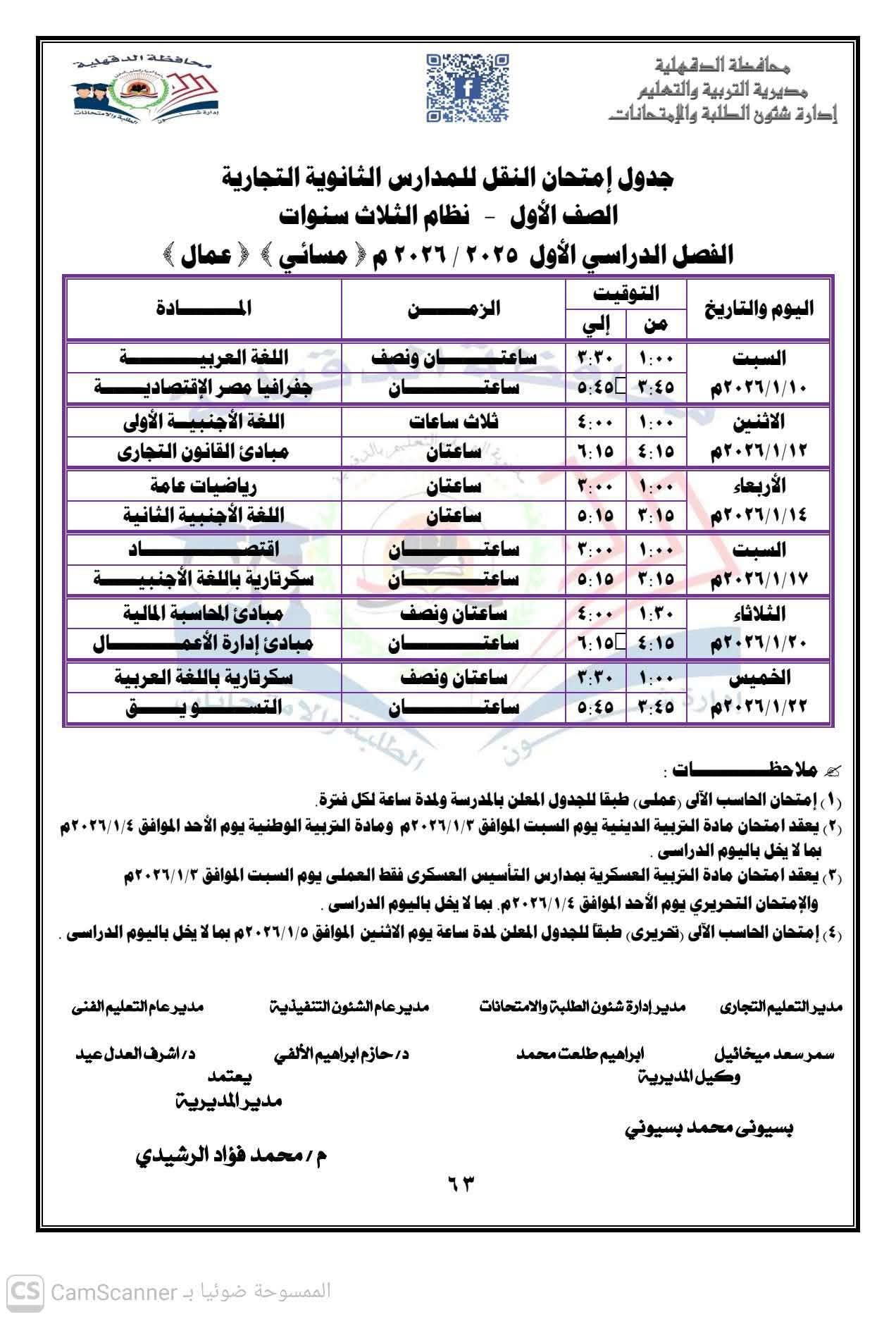 جدول امتحانات الصف الأول والثاني الثانوي التجاري 2025 بالدقهلية