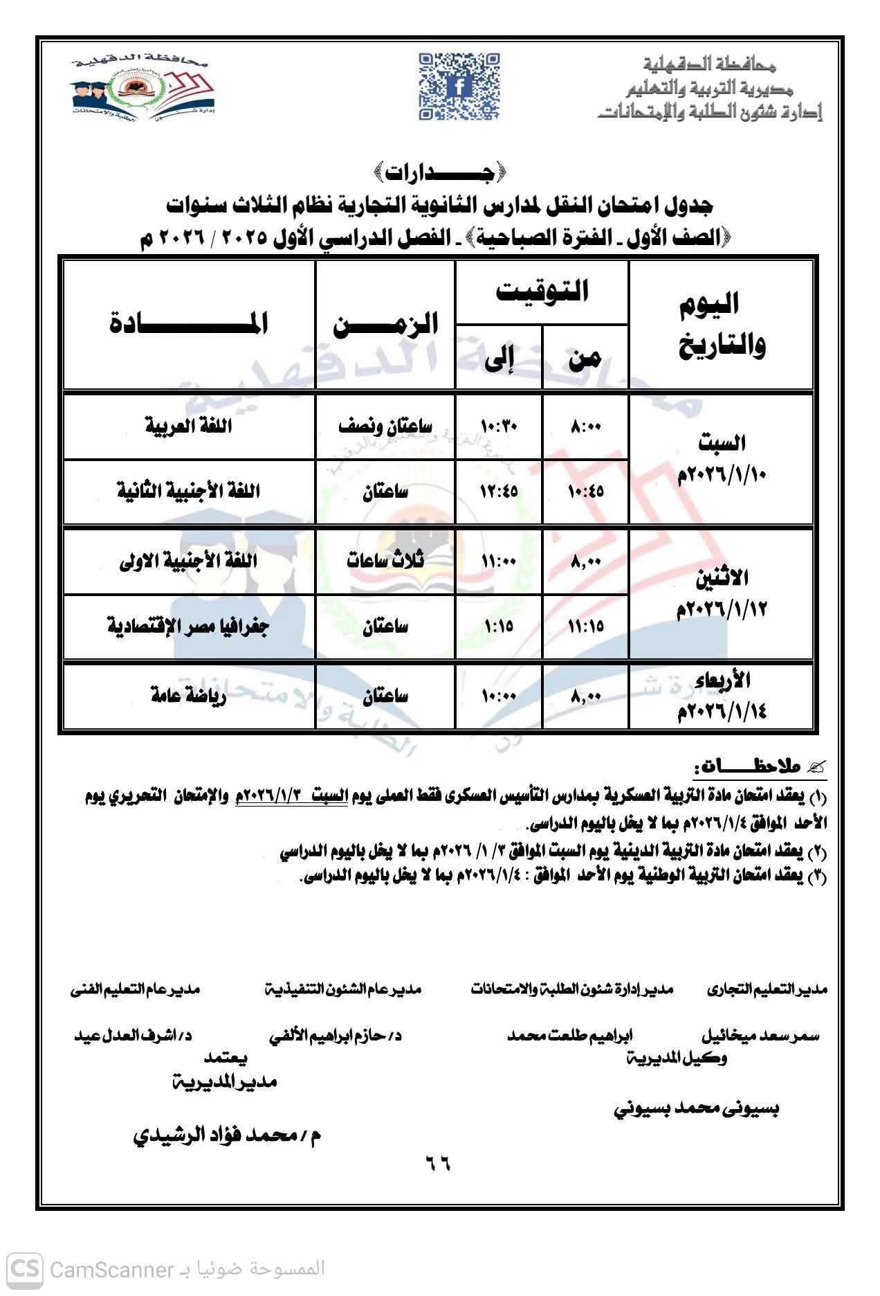 جدول امتحان النقل لمدارس الثانوية التجارية بمحافظة الدقهلية 2025-2026