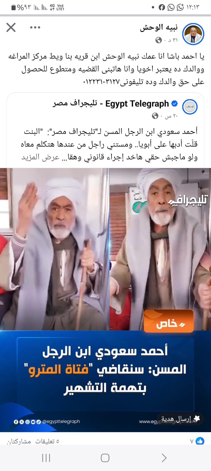 وقال نبيه الوحش معلقا على منشور "تليجراف مصر" عبر "فيسبوك": " أنا نبية الوحش ابن قرية بنا ويط وأنت تعتبر أخويا وأنا متطوع للحصول على حقك".