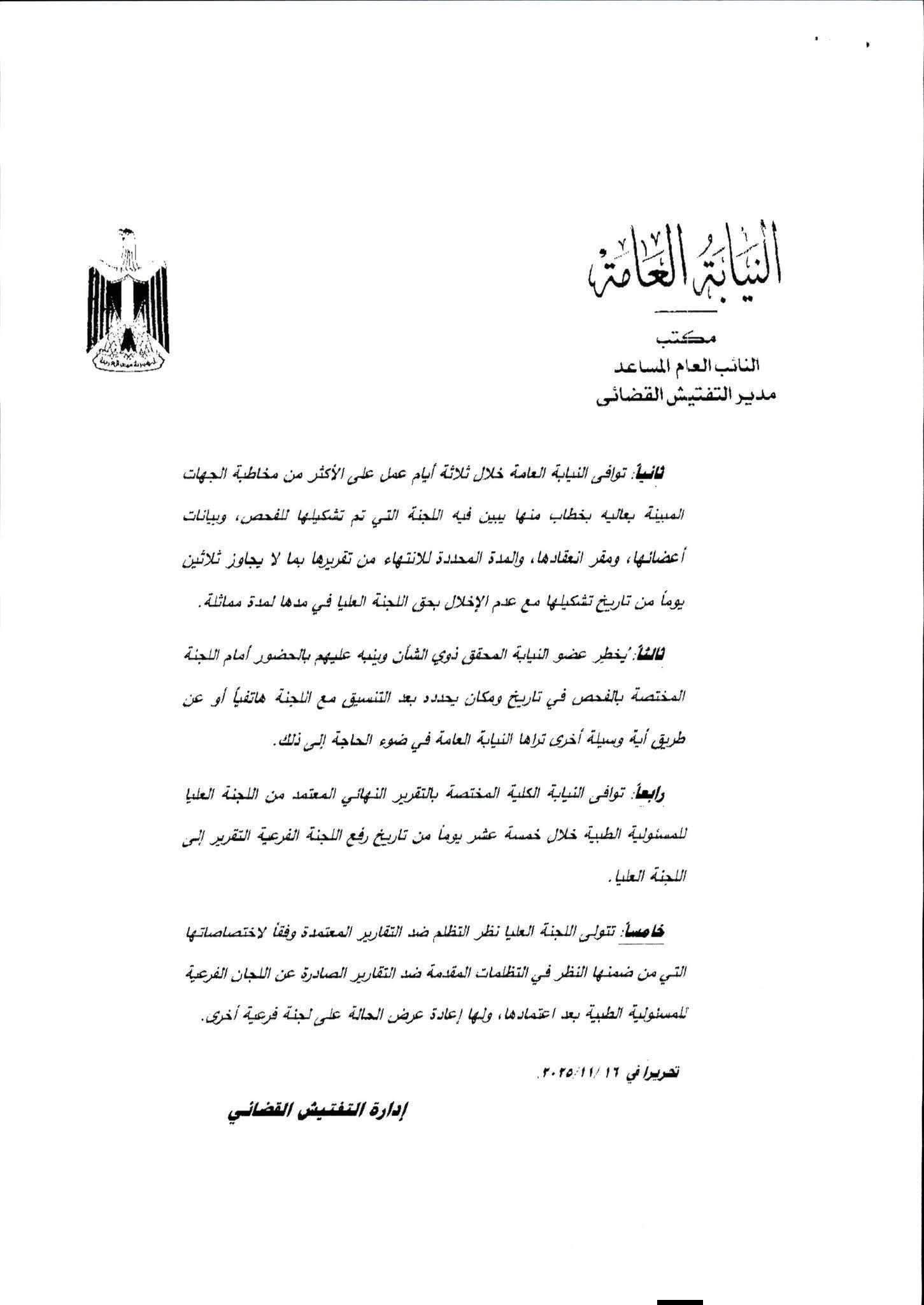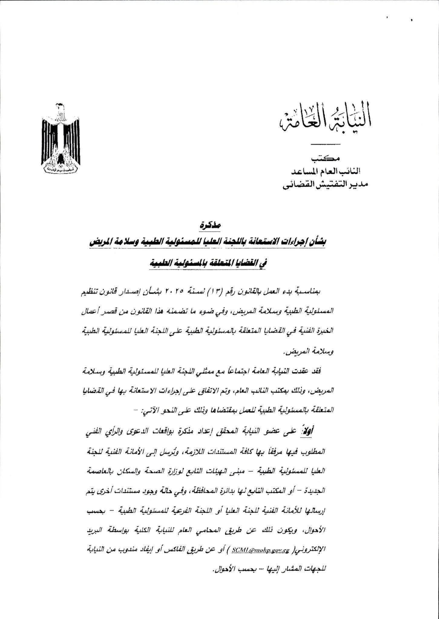 يلتزم عضو النيابة المحقق بإعداد مذكرة تتضمن وقائع الدعوى وطلب الرأي الفني، وإرفاق جميع المستندات اللازمة قبل إرسالها إلى الأمانة الفنية للجنة العليا للمسؤولية الطبية بمبنى الهيئات التابع لوزارة الصحة والسكان بالعاصمة الإدارية، أو إلى المكتب الفرعي بالمحافظة المعنية.