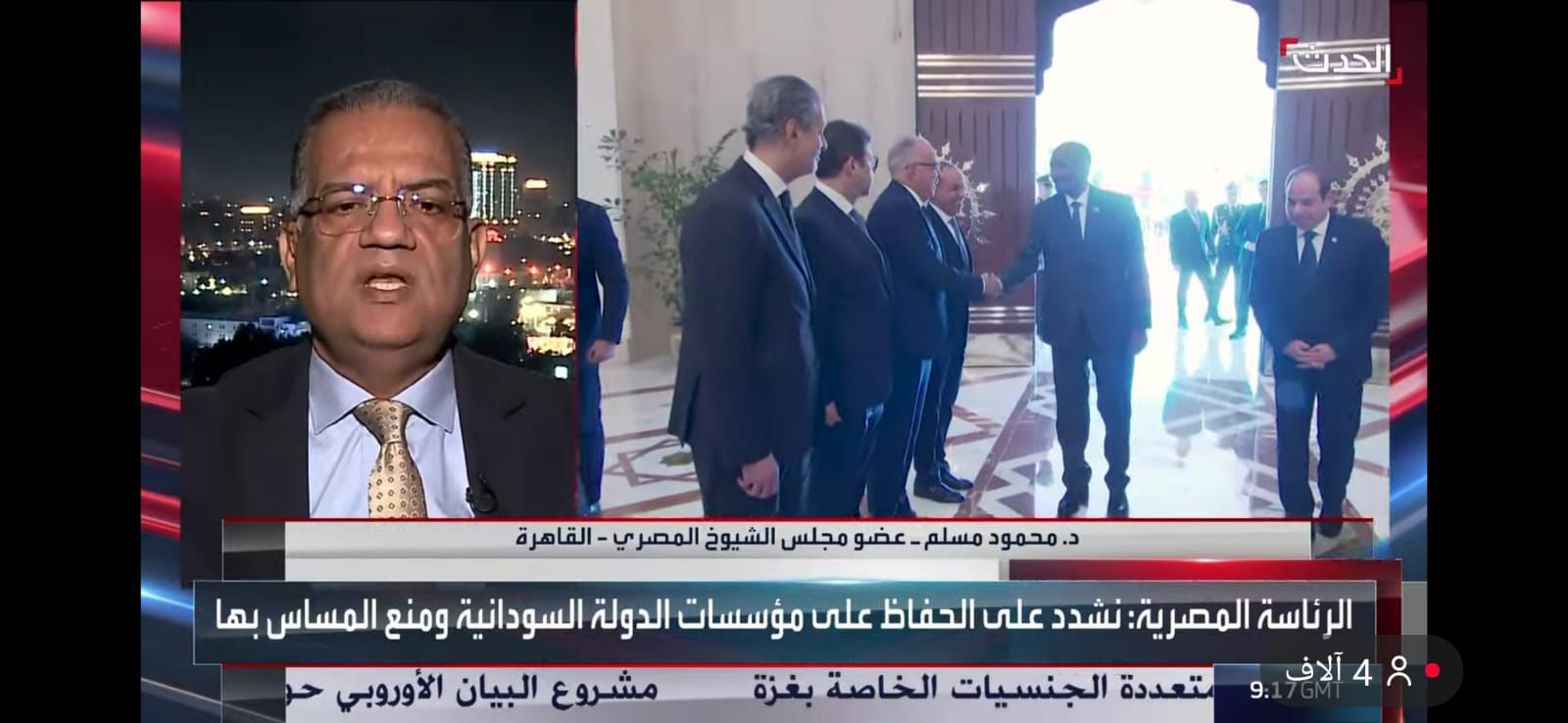 وأضاف مسلم خلال لقاء مع قناة الحدث: البيان المصري بشأن ما يجري في السودان هو الأقوى منذ بداية الأزمة، وتحدث عن خطوط حمراء واضحة، وهذه الخطوط الحمراء اليوم في السودان تشبه الخطوط الحمراء التي أعلنها الرئيس عبدالفتاح السيسي من قبل بالنسبة لليبيا لحمايتها من التدخل الخارجي في شؤونها الداخلية.