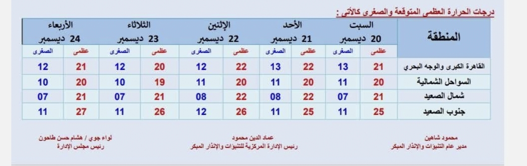 وكشفت الهيئة العامة للأرصاد الجوية حالة الطقس غدًا السبت الموافق 20 ديسمبر الجاري، وكذلك الأيام المقبلة على محافظة القاهرة وجميع الأنحاء.