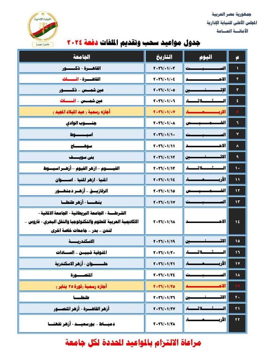 أعلنت النيابة الإدارية جدول سحب وتقديم الملفات الصادر عن الأمانة العامة للمجلس الأعلى، الخاص بالمتقدمين لمسابقة التعيين في وظيفة معاون نيابة من خريجي دفعة 2024 من كليات الحقوق، والشريعة والقانون، وكلية الشرطة.