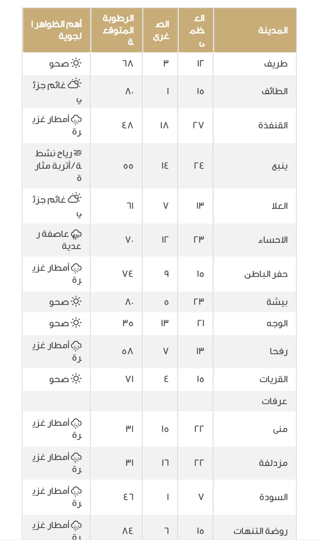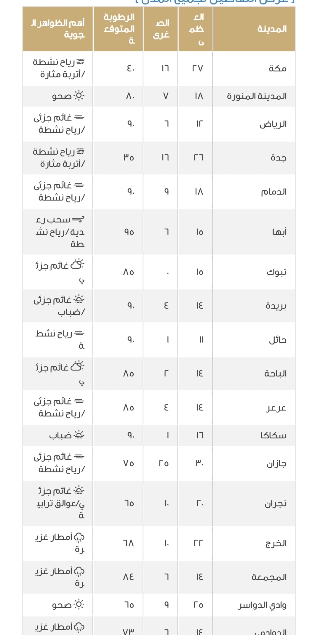 وأوضح المركز الوطني للأرصاد درجات الحرارة غدًا السبت في مدن المملكة والتي جاءت كالتالي: