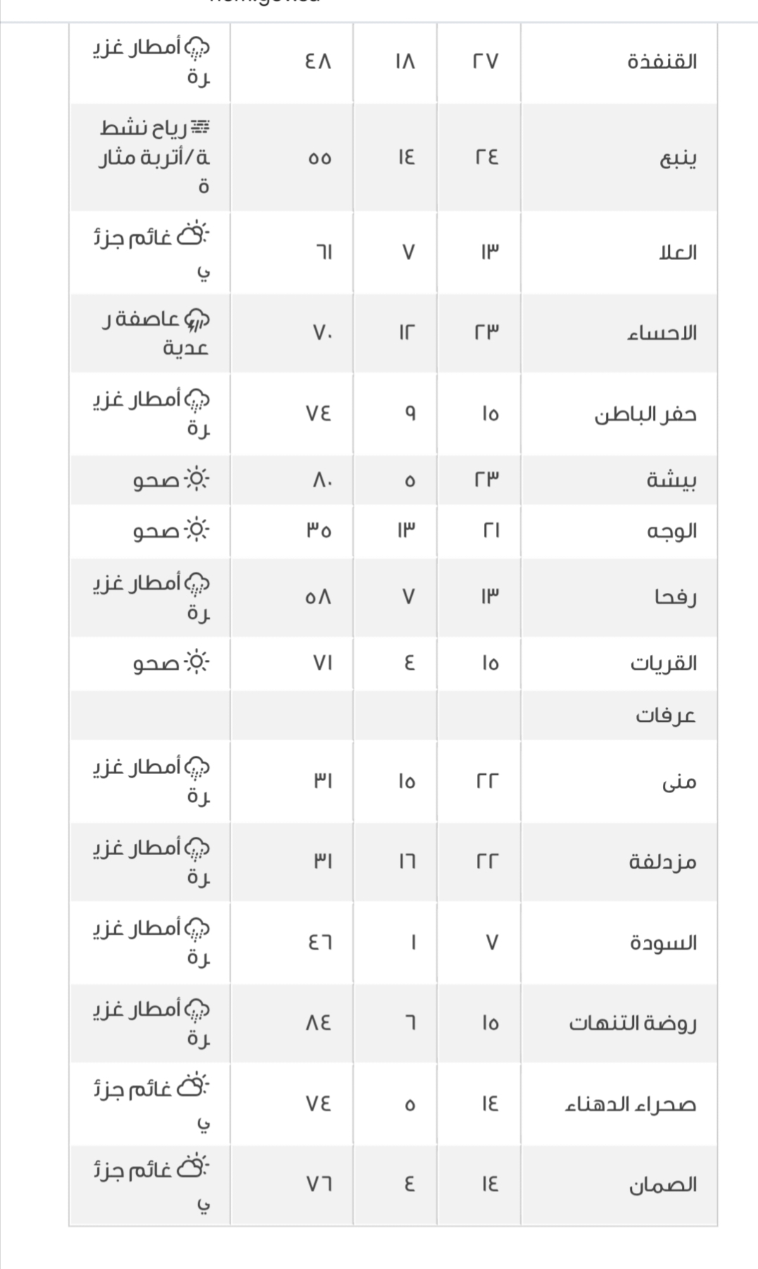 وأشار المركز الوطني للأرصاد بالمملكة العربية السعودية، إلى إنه لا تزال الفرصة مهيأة لهطول امطار رعدية على الأجزاء الجنوبية من المنطقة الشرقية.