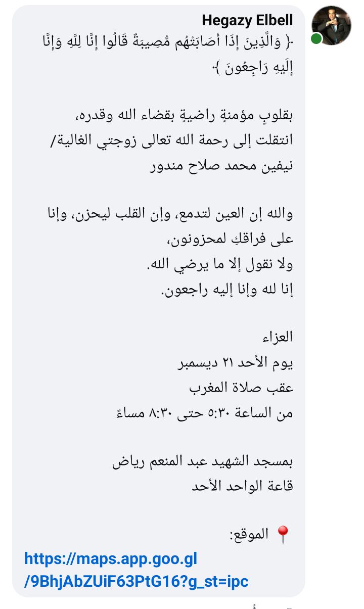 وأوضح موعد ومكان العزاء، مشيرًا إلى أنه سيُقام يوم الأحد 21 ديسمبر، عقب صلاة المغرب، من الساعة 5:30 حتى 8:30 مساءً، بمسجد الشهيد عبدالمنعم رياض بمنطقة سموحة، قاعة "الواحد الأحد".