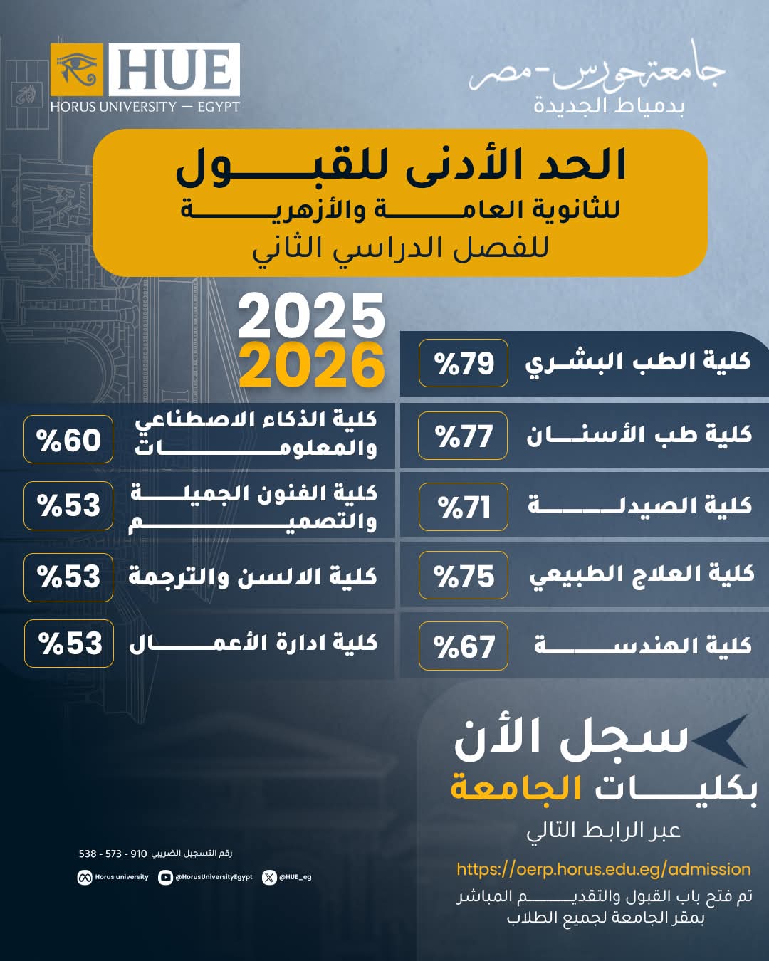 أعلنت جامعة حورس بدمياط الجديدة، عن فتح باب التقديم المباشر للالتحاق بكلياتها المختلفة للفصل الدراسي الثاني العام الجامعي 2025-2026، وذلك لطلاب الثانوية العامة، الثانوية الأزهرية، شهادات المعادلة “العربية والأجنبية”.