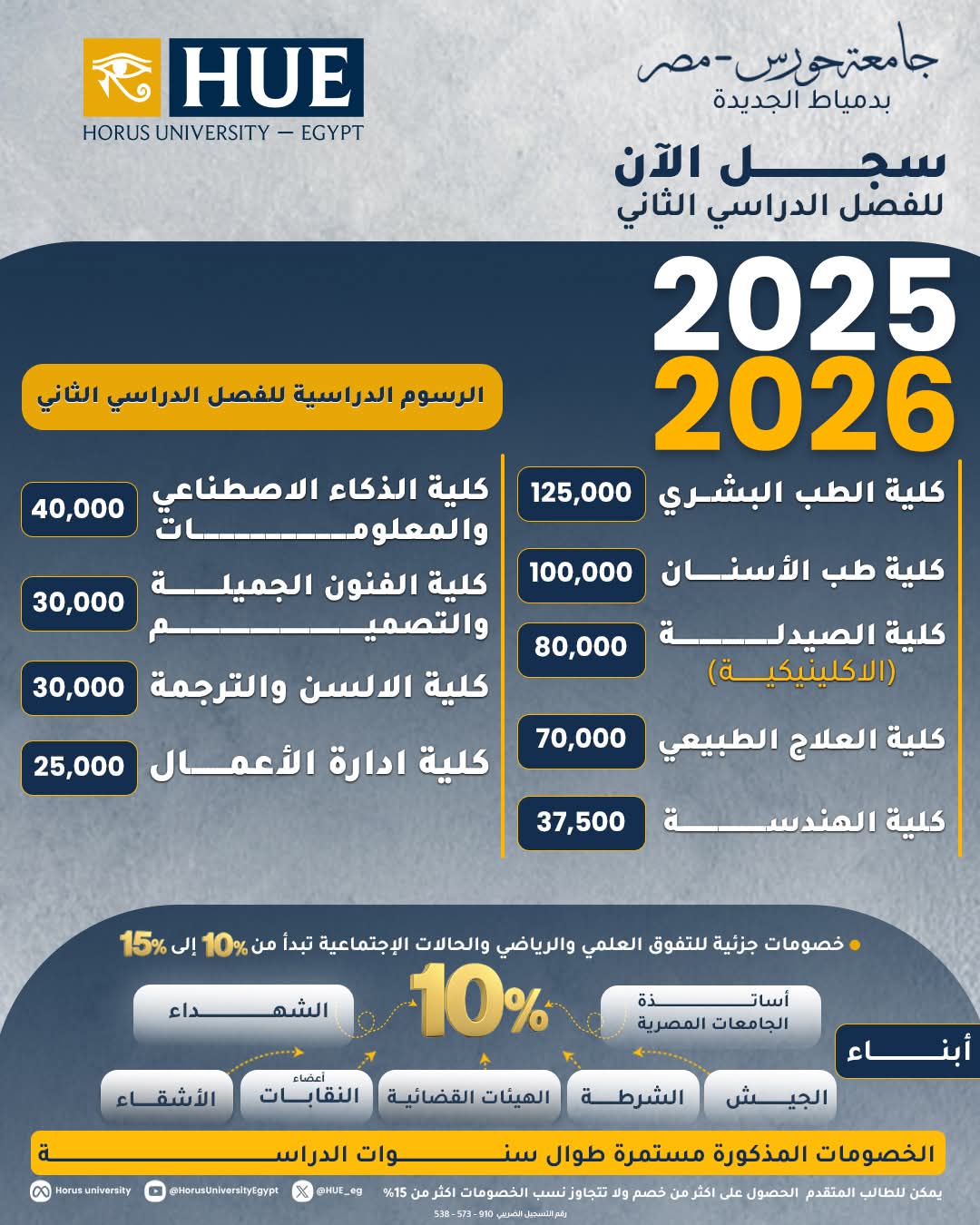 مصاريف جامعة حورس للفصل الدراسي الثاني 2025-2026