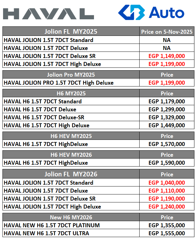 أعلنت شركة جي بي أوتو، الوكيل الحصري لسيارات هافال في السوق المصرية، أسعار هافال H6 موديل 2026 بنسختي البنزين والهايبرد.