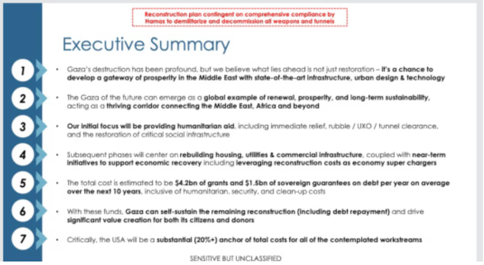 ويقر الاقتراح، في صفحته الثانية وبخط عريض وباللون الأحمر، بأن إعادة إعمار غزة تعتمد بشكل أساسي على التزام “حماس” بـ"نزع السلاح وتفكيك جميع الأسلحة والأنفاق".