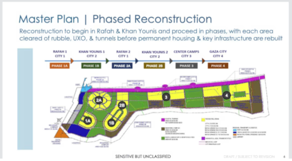 وفي مراحل لاحقة، تشمل الخطة مشروعات طويلة الأمد، من بينها تطوير الواجهة الساحلية لقطاع غزة، وإنشاء وسائل نقل حديثة، إضافة إلى مشروعات عقارية واسعة.