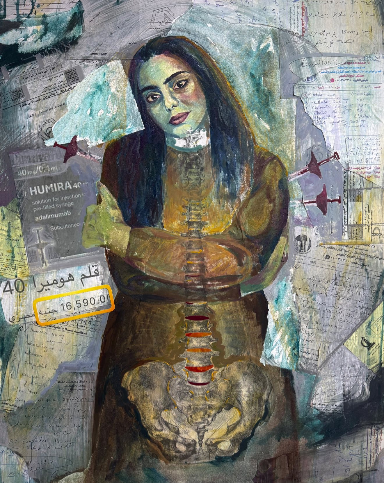 فكرت ضحى محمد، صاحبة الـ 21 عاما التي تهتم بالفن المعاصر والتجريب، في تحويل معاناتها مع مرض التيبس الفقاري المزمن (Ankylosing Spondylitis)، الذي تم تشخيصها به منذ أربع سنوات، إلى لوحة فنية بتكليف جامعي، حيث شعرت بأنها أمام متنفس لما عانته سنين طوال.