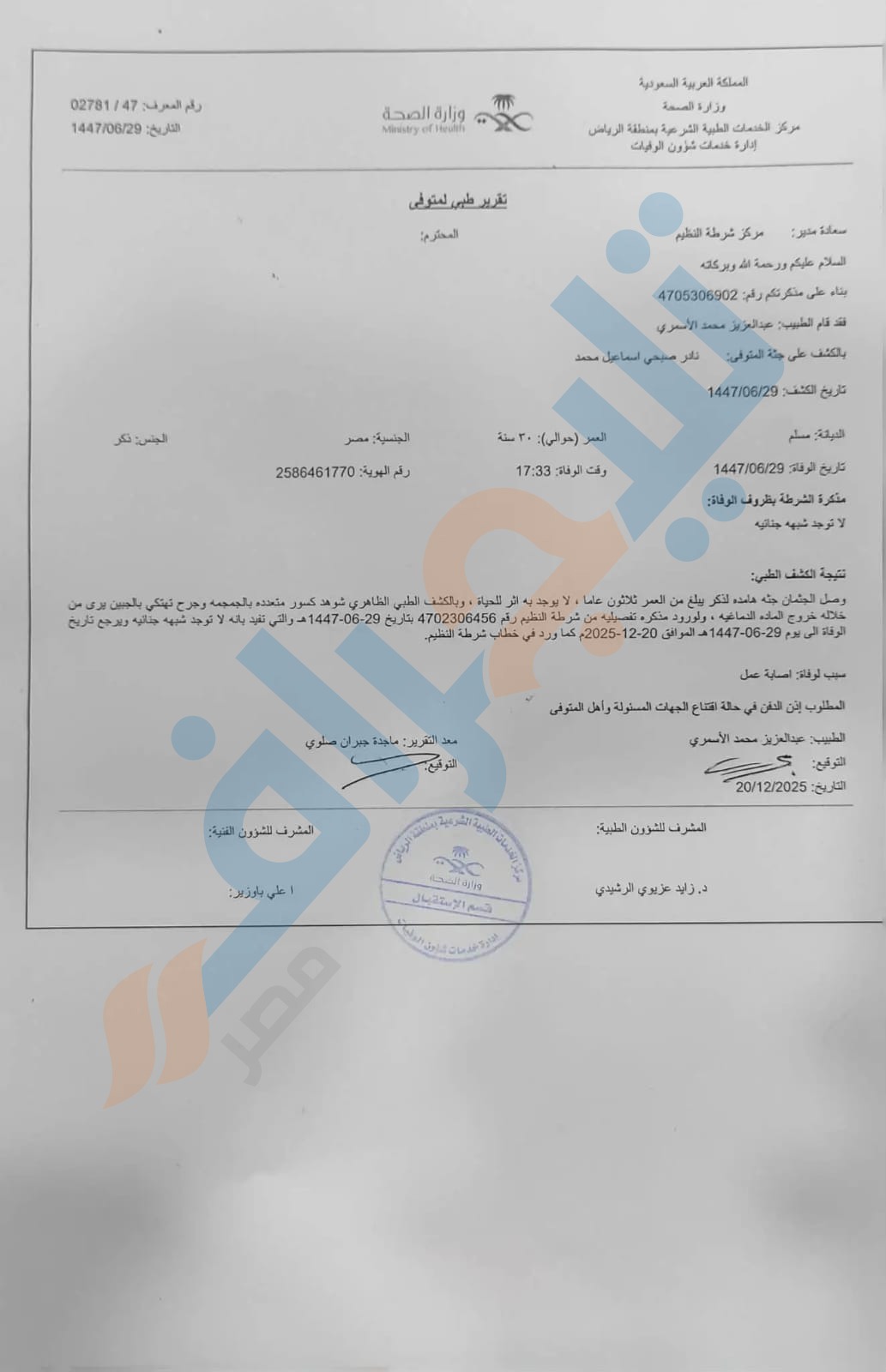 وصل الجثمان جثة هامدة لذكر يبلغ من العمر ثلاثون عاما، لا يوجد به أثر للحياة، وبالكشف الطبي الظاهري شوهد كسور متعددة بالجمجمة وجرح لهتكي بالجبين يرى من خلاله خروج المادة الدماغية، ولورود مذكرة تفصيلية من شرطة النظيم رقم 4702306456 بتاريخ 29-06-1447 هـ، والتي تفيد بأنه لا توجد شبهة جنائية، ويرجع تاريخ الوفاة إلى يوم 29-06-1447 هـ الموافق 20-12-2025م، كما ورد في خطاب الشرطة، وأن سبب الوفاة إصابة عمل.