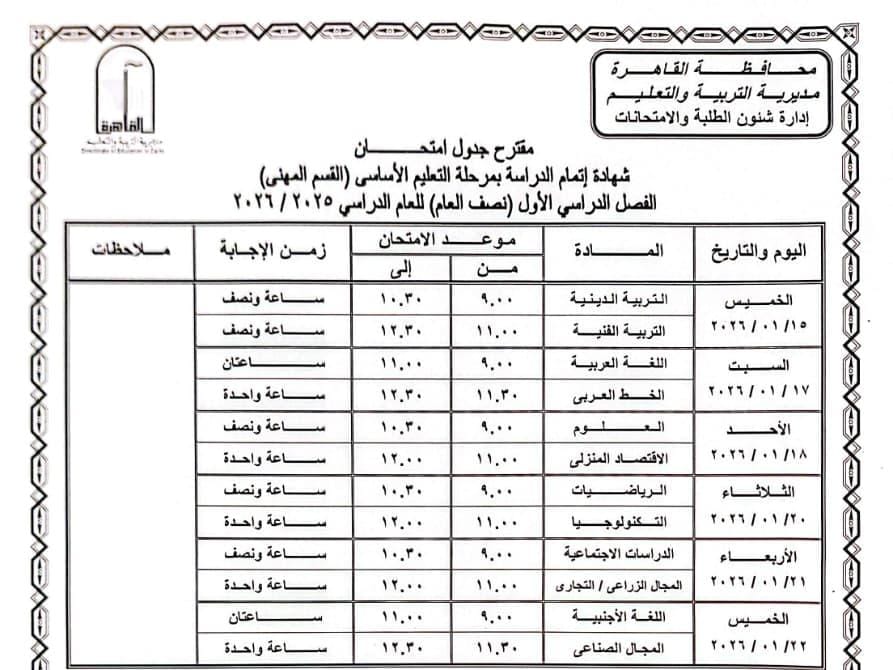 جدول امتحانات المرحلة الإعدادية 2026 بالقاهرة