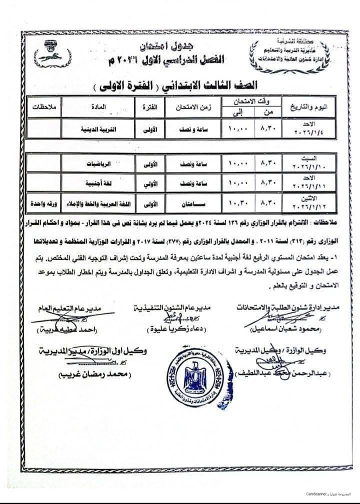 يأتي جدول امتحانات الصف الثالث الابتدائي 2026 بالشرقية كالتالي: