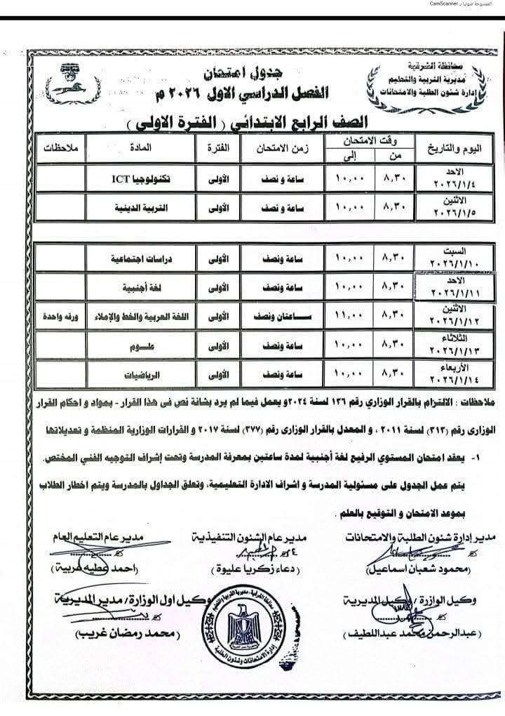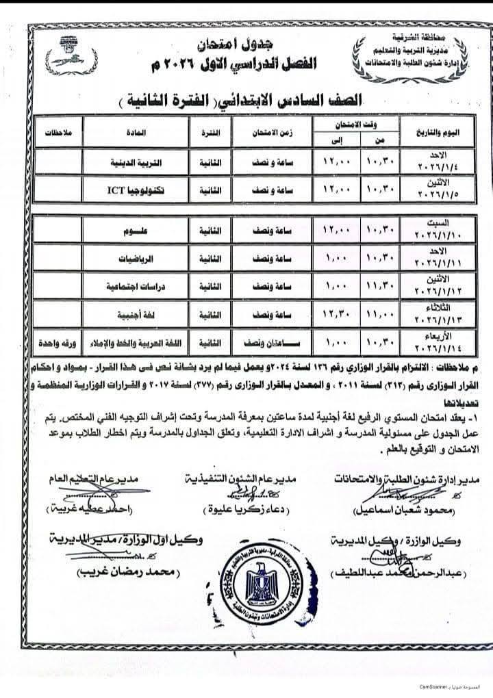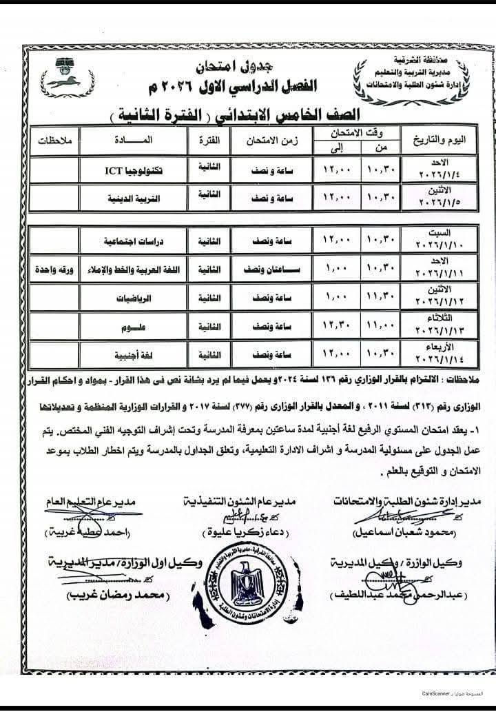 يأتي جدول امتحانات الصف الرابع والخامس والسادس الابتدائي 2026 بالشرقية كالتالي: