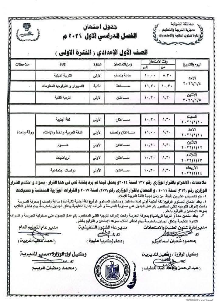 جدول امتحانات الصف الأول الإعدادي 2026 بالشرقية