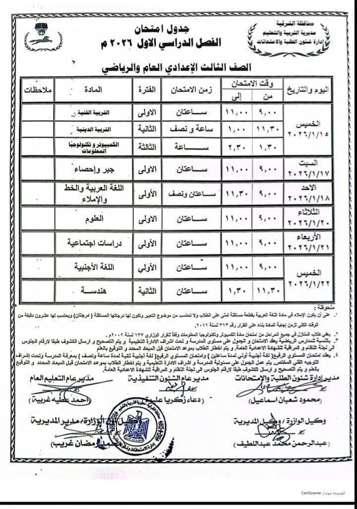 يأتي جدول امتحانات الصف الثالث الإعدادي 2026 بالشرقية كالتالي:
