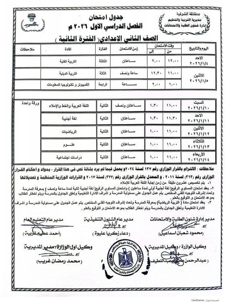 جدول امتحانات الصف الثاني الإعدادي 2026 بالشرقية
