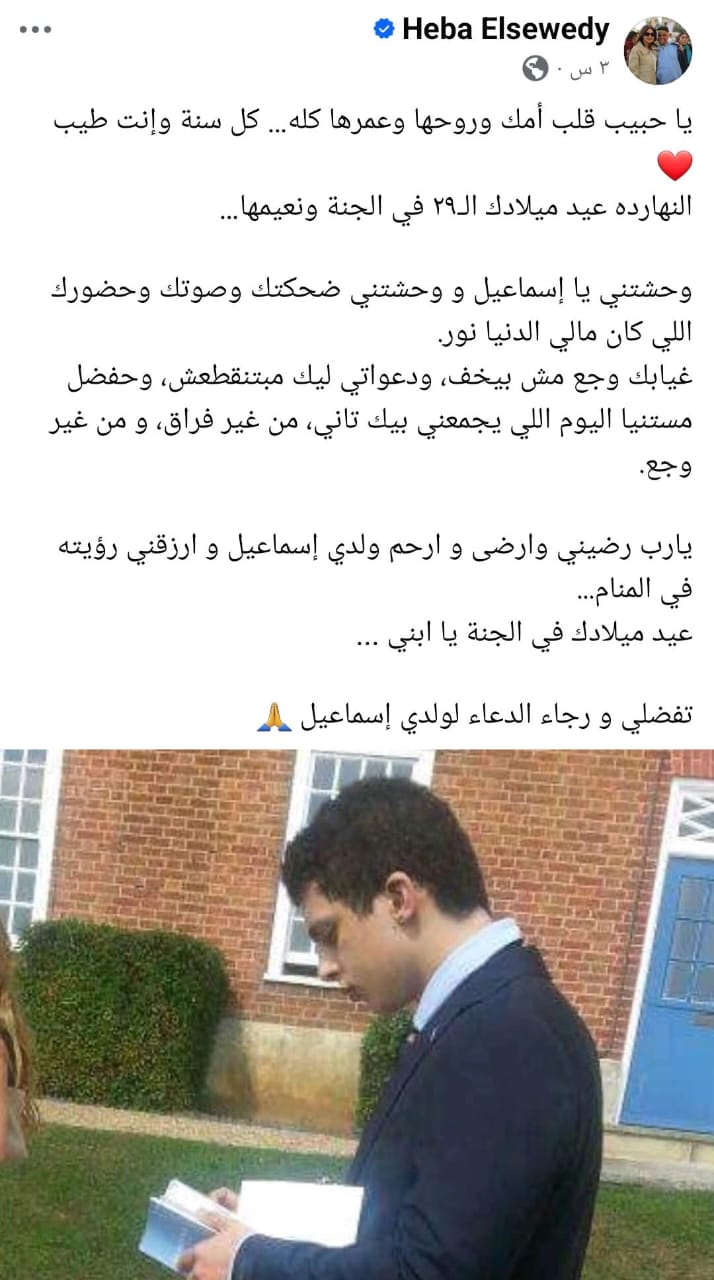 واختتمت منشورها بالدعاء لنجلها الراحل، وطلب الدعاء له من المتابعين:" يارب راضيني وارضى عني وارحم ولدى اسماعيل، وارزقني رؤيته في المنام، عيد ميلادك في الجنة يا ابني".