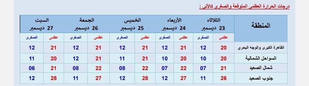 تشير التوقعات إلى أن الفترة من يوم 23 وحتى يوم 27 ديسمبر ستشهد انخفاضًا تدريجيًا في درجات الحرارة، حيث تشهد البلاد ظهور شبورة مائية كثيفة أحيانًا على بعض الطرق المؤدية من وإلى شمال البلاد وحتى القاهرة الكبرى وشمال الصعيد ووسط سيناء، وذلك خلال الفترة من الساعة 3 حتى 9 صباحًا، مع وجود نشاط رياحي يومي الجمعة 26 ديسمبر ويوم السبت 27 ديسمبر على مناطق القاهرة الكبرى وشمال الصعيد.
