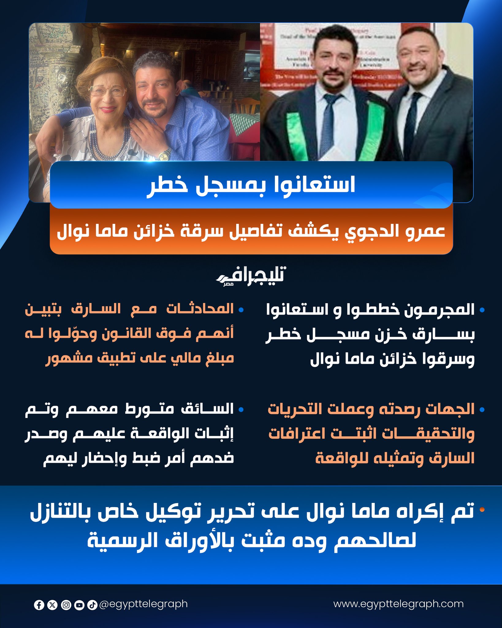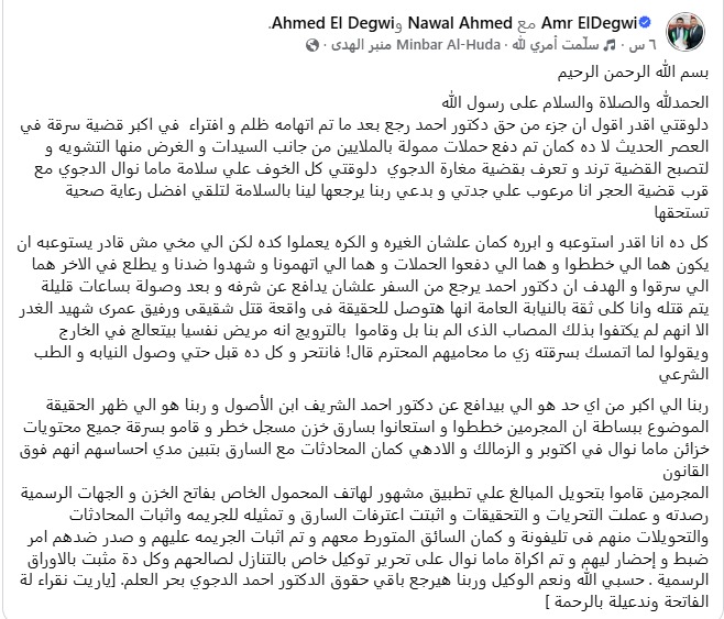 وقال الدجوي في منشور عبر حسابه الشخصي على “فيسبوك”: “المجرمون خططوا واستعانوا بسارق خزن مسجل خطر وسرقوا خزائن ماما نوال والمحادثات مع السارق بتبين إنهم فوق القانون”.