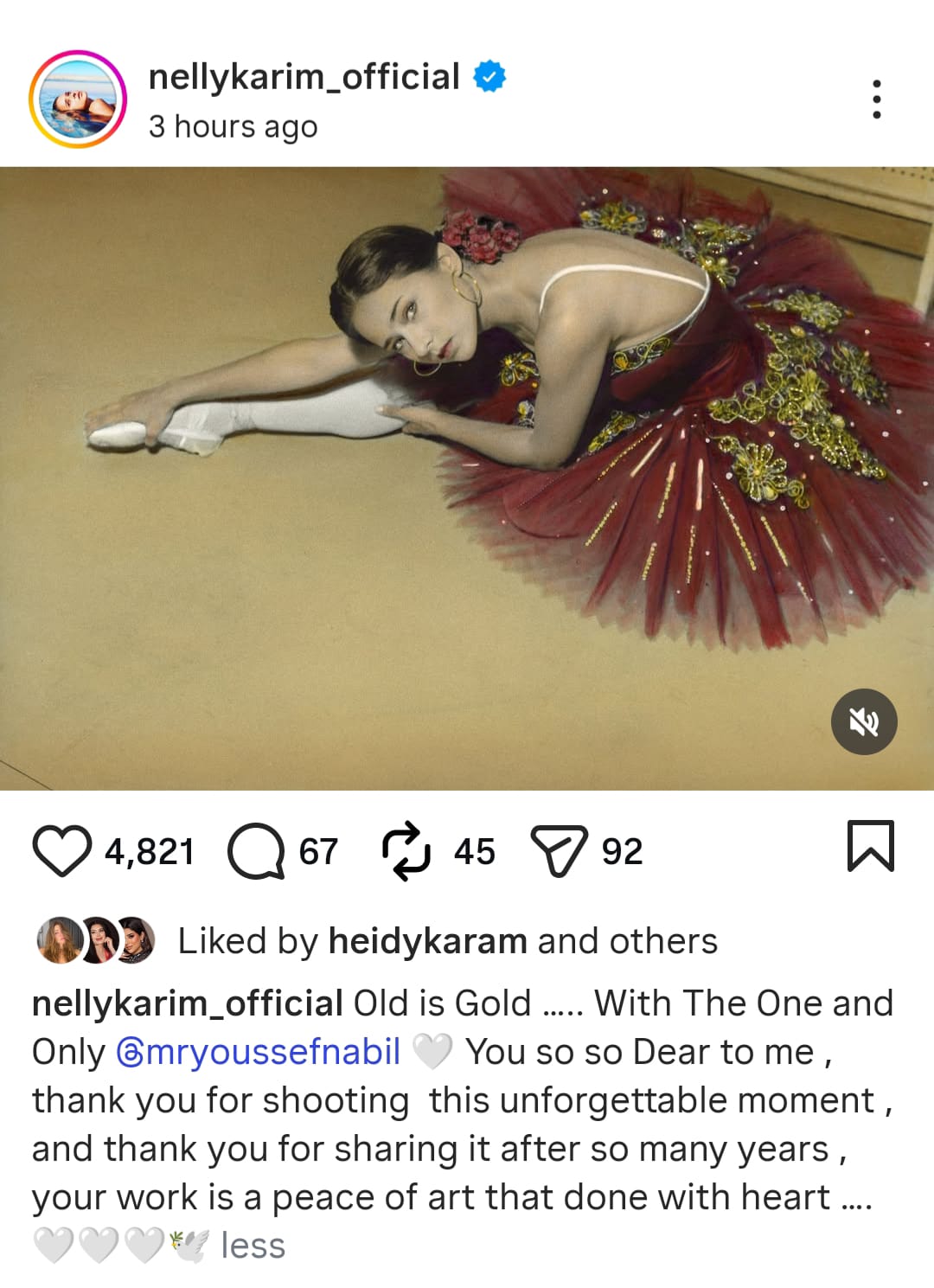 نشرت نيللي كريم الصورة عبر حسابها الرسمي على إنستجرام وعلقت عليها بالقول: القديم ذهب مع المصور الرائع يوسف نبيل، أنت عزيز علي جداً، شكرًا لك على تصوير هذه اللحظة التي لا تُنسى، وشكرًا لك على مشاركتها بعد كل هذه السنوات، عملك قطعة فنية مصنوعة من القلب”
