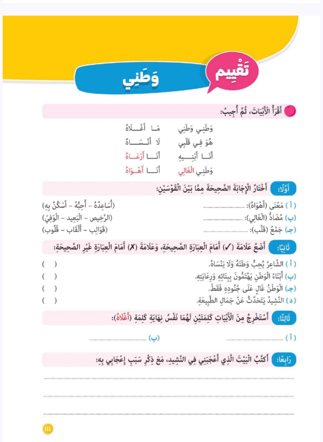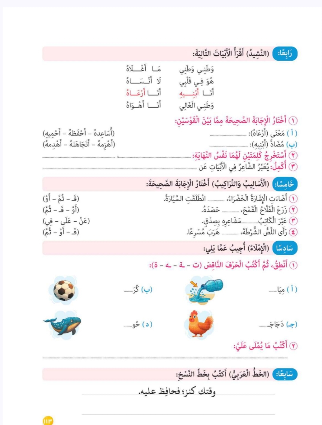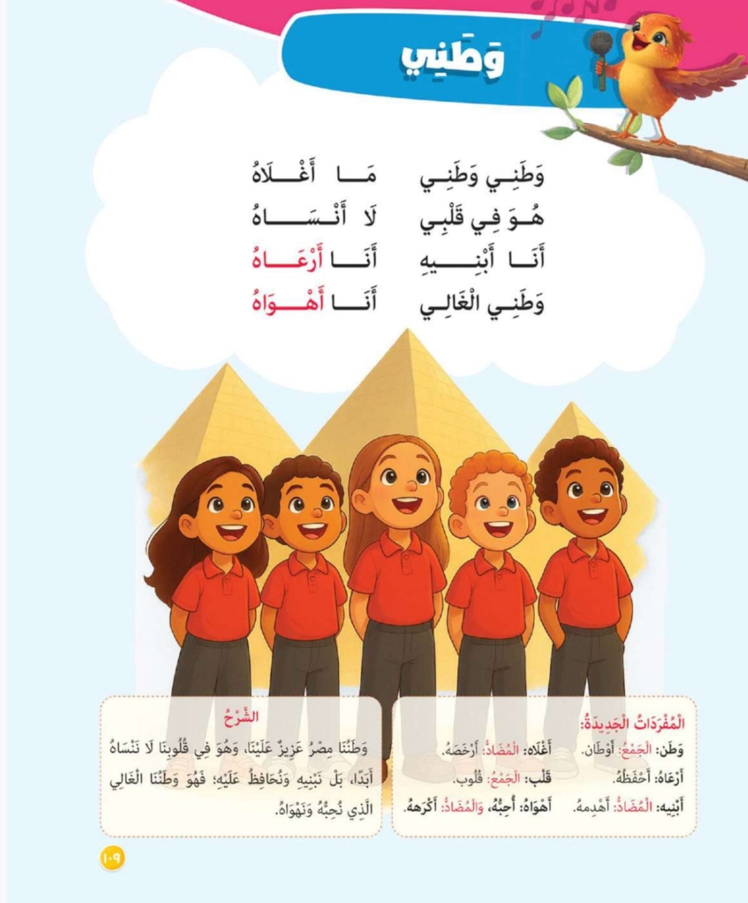 ويعد نشيد وطني الدرس الرابع في الوحدة الثالثة والأخيرة من منهج مادة اللغة العربية للصف الثالث الابتدائي للعام الدراسي 2025-2026.