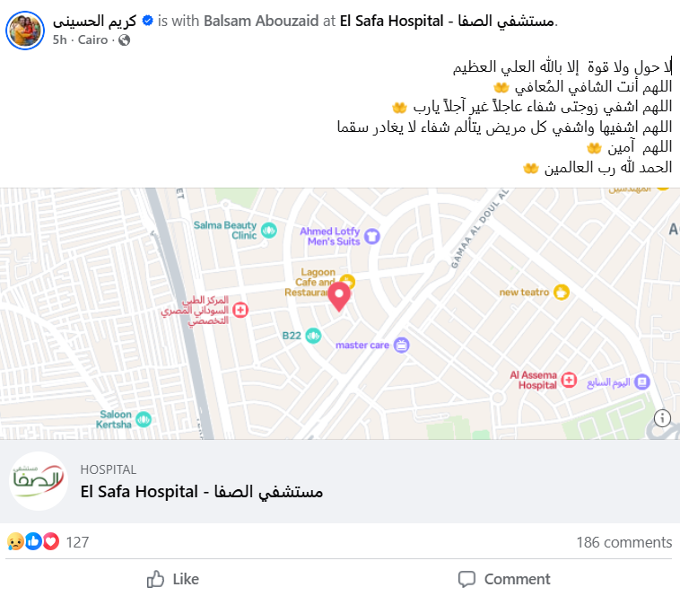 نشر كريم الحسيني منشورًا عبر حسابه الرسمي على موقع التواصل الاجتماعي “فيسبوك”، دعا فيه بالشفاء العاجل لزوجته، حيث كتب: "لا حول ولا قوة إلا بالله العلي العظيم، اللهم أنت الشافي المُعافي، اللهم اشفِ زوجتي شفاءً عاجلًا غير آجل يا رب، اللهم اشفها واشفِ كل مريض يتألم شفاءً لا يغادر سقمًا، اللهم آمين، الحمد لله رب العالمين ".
