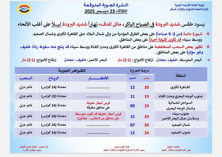 برودة وأمطار وشبورة، حالة الطقس اليوم الثلاثاء 23 ديسمبر 2025 في مصر