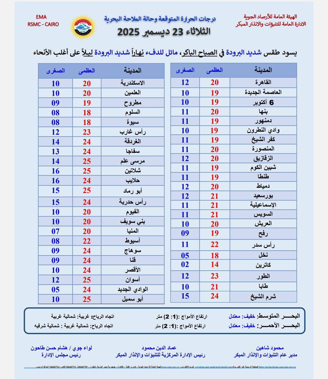 وتشير توقعات هيئة الأرصاد، إلى أن البلاد تشهد اليوم طقسًا شديد البرودة خلال ساعات الصباح الباكر، يميل للدفء نهارًا، بينما يعود الطقس ليصبح شديد البرودة ليلًا على أغلب أنحاء الجمهورية.