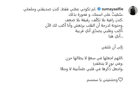 ووصفت الراحلة بكلمات صادقة ومؤثرة، حيث كتبت: “لم تكوني عمتي فقط، كنتِ صديقتي وملجأي.. سُمّيت على اسمك وفخورة بذلك”.