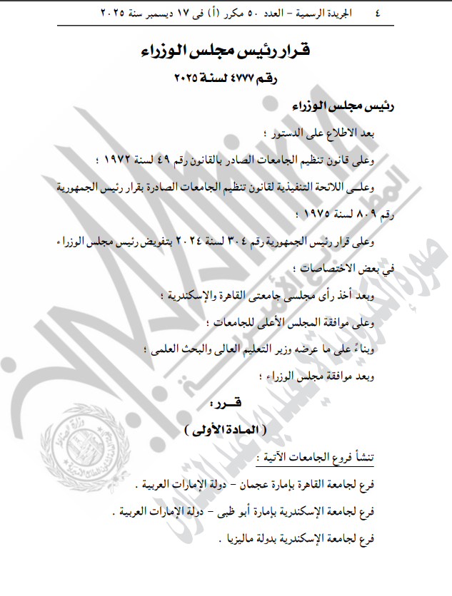 ونص القرار رقم 4777 لسنة 2025 الذي تم نشره في الجريدة الرسمية، اليوم، على أن تنشأ فروع الجامعات الآتية:
