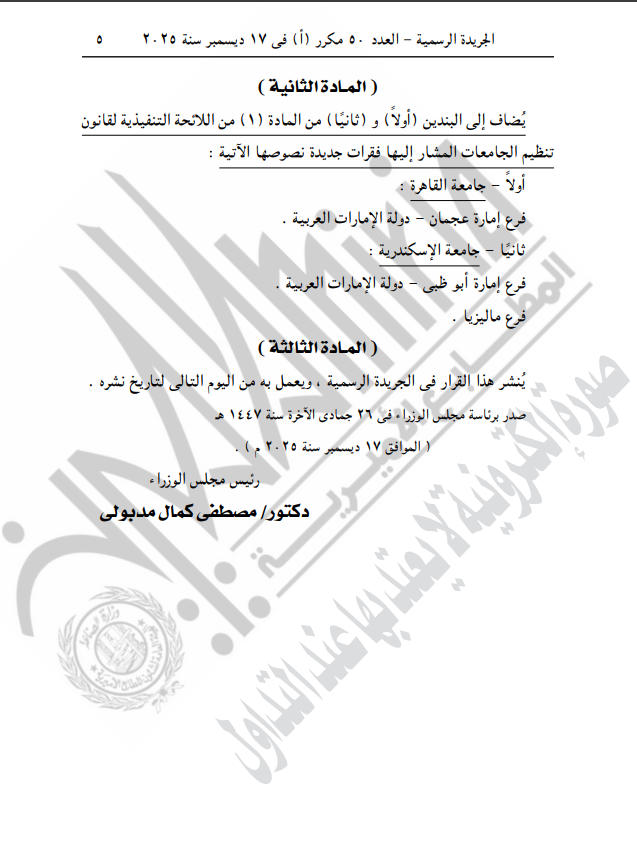 نشرت الجريدة الرسمية، قرار رئيس الوزراء، الدكتور مصطفى مدبولي، بشأن إنشاء فروع عدد من الجامعات في الإمارات وماليزيا.