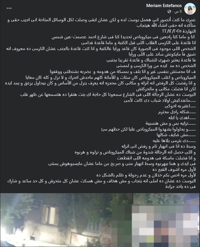 مريم استيفانوس قالت في منشور لها عبر “فيسبوك” إنها كانت تستقل سيارة ميكروباص رفقة والدتها، في منطقة عين شمس، حيث كانت تجلس على “الكرسي القلاب” مستندة بظهرها على زجاج الشباك، وإذ بها تشعر بيد تلامس ظهرها من قبل الشخص الجالس خلفها على الكنبة الأخيرة.
