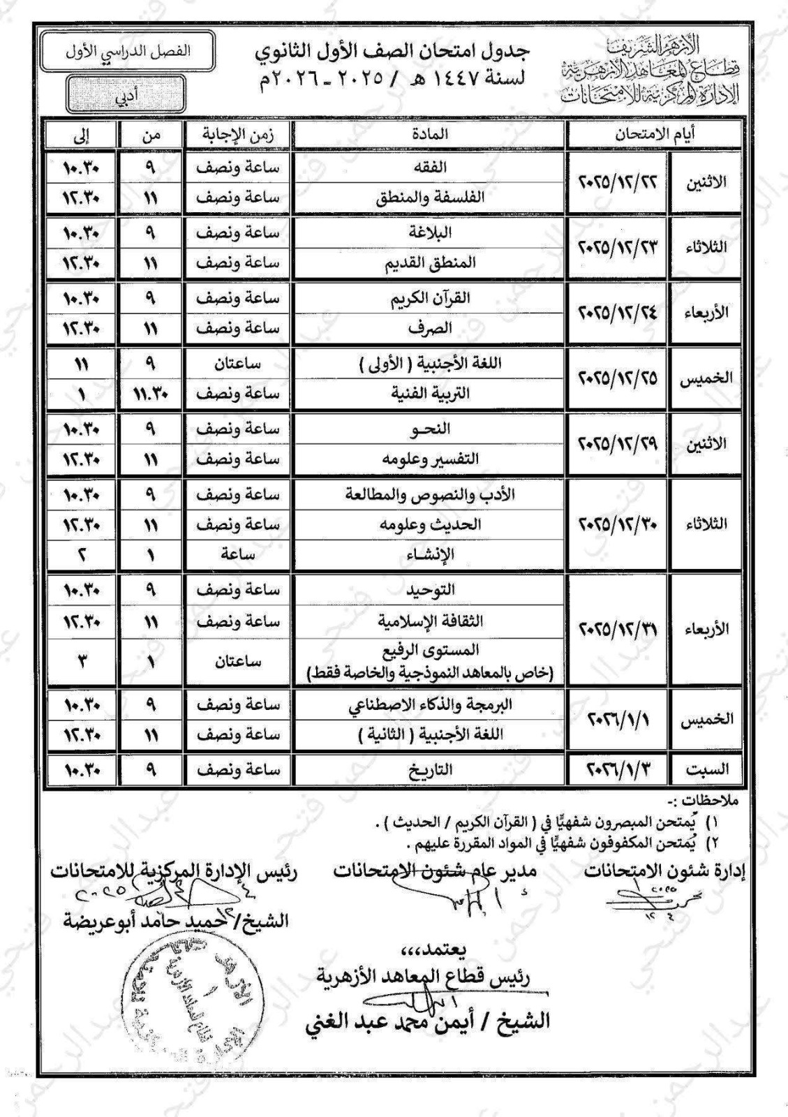 جدول امتحانات الأزهر 2026 الصف الأول الثانوي أدبي