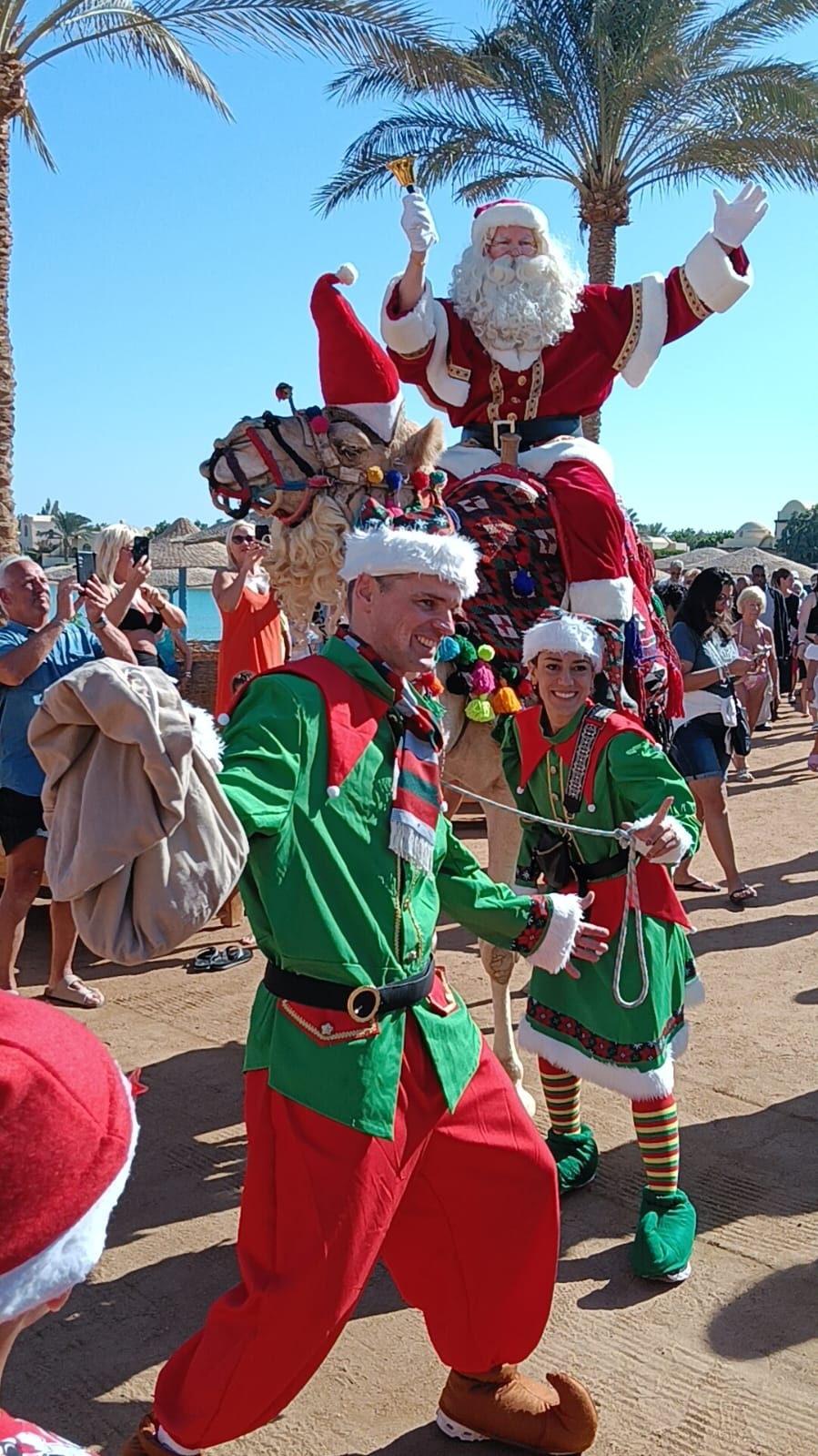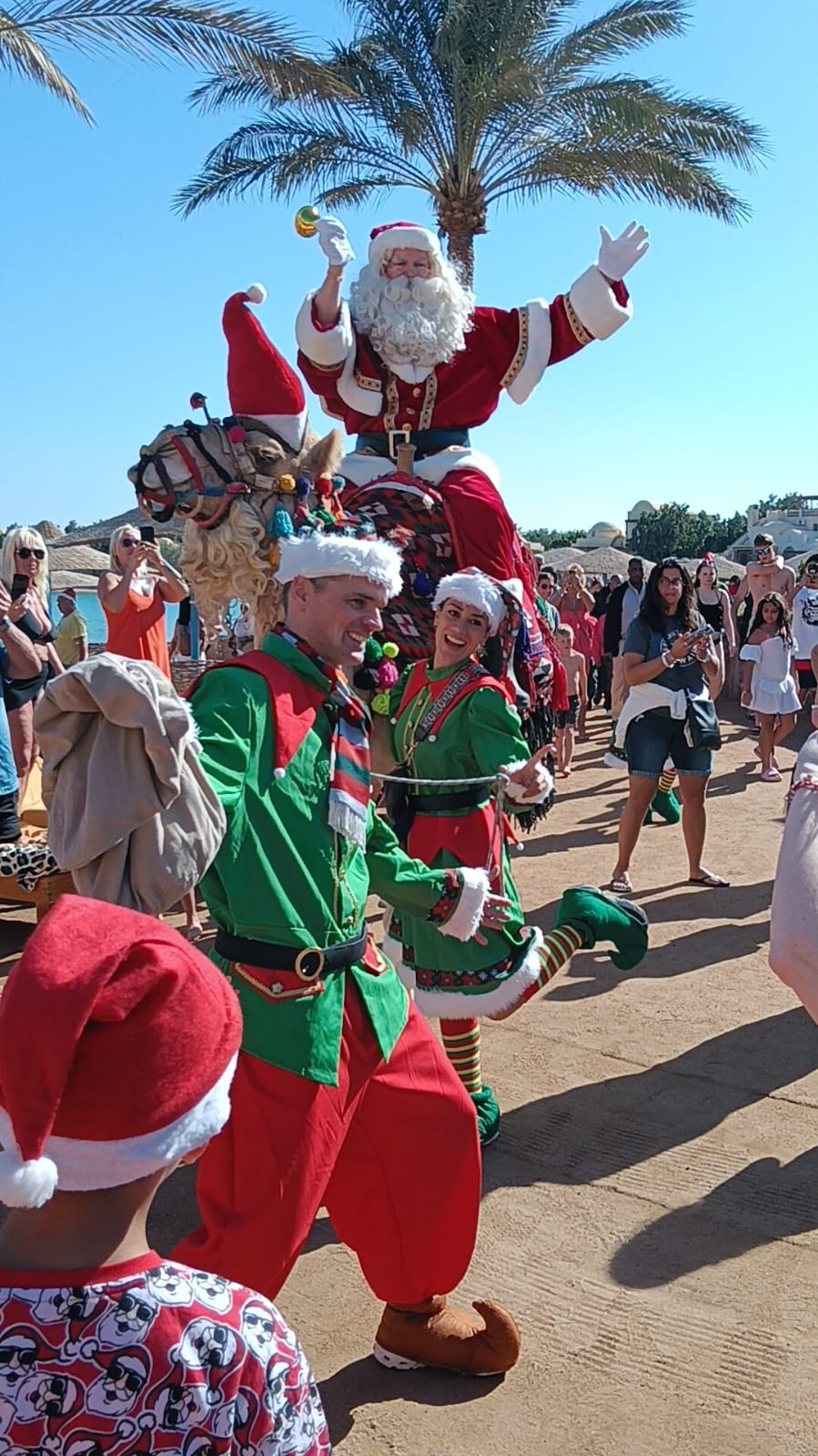 وعند وصوله إلى الغردقة، واصل “هلارت” ظهوره اللافت بملابس بابا نويل، حيث ركِب الجِمال ووزّع الهدايا على السياح داخل الفنادق وعلى الشواطئ، في مشاهد أضفت البهجة والفرحة وانعكست إيجابًا على الحركة السياحية بالمدينة.