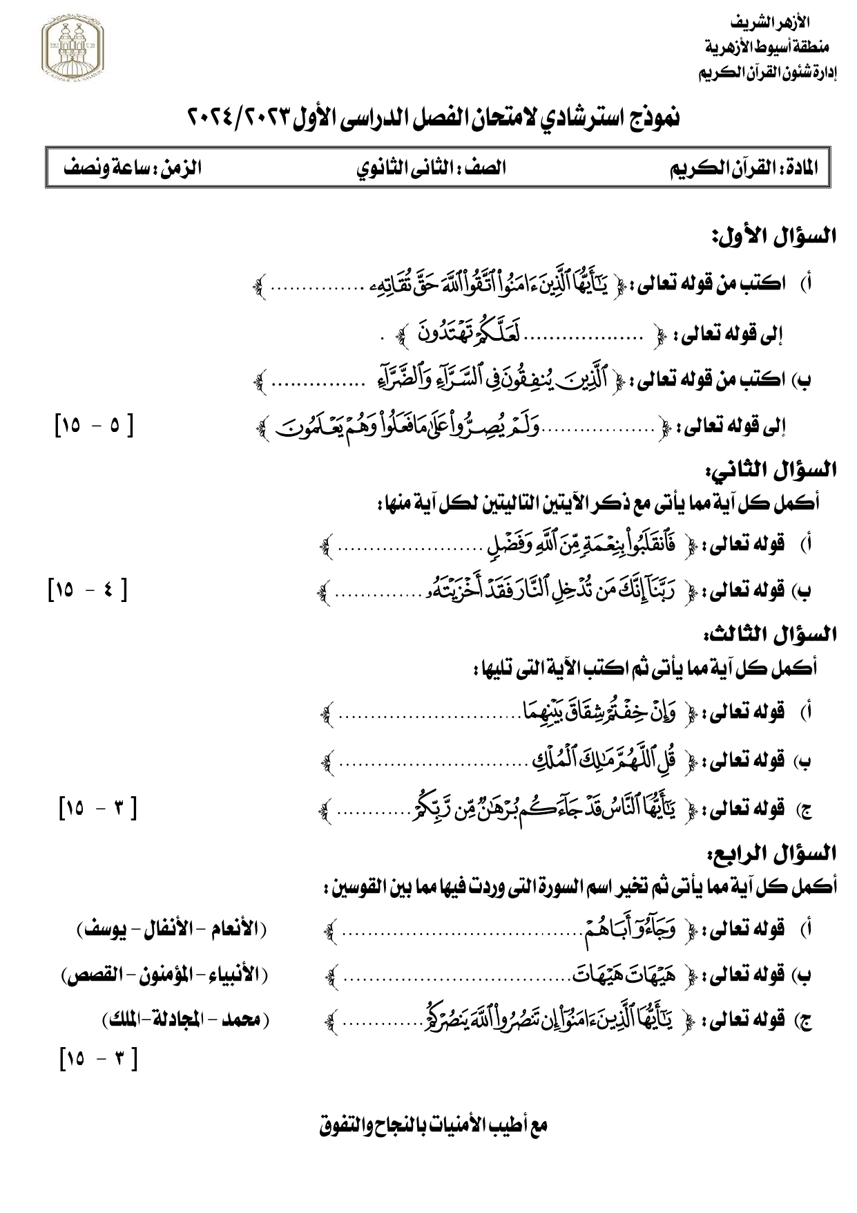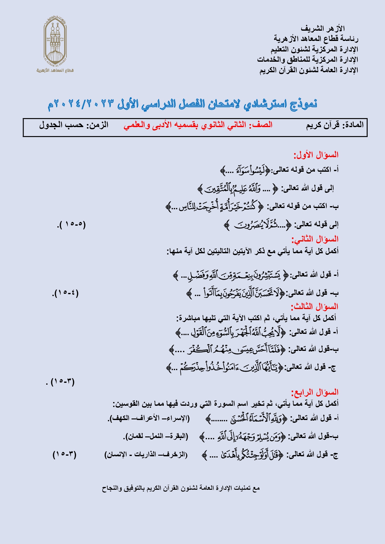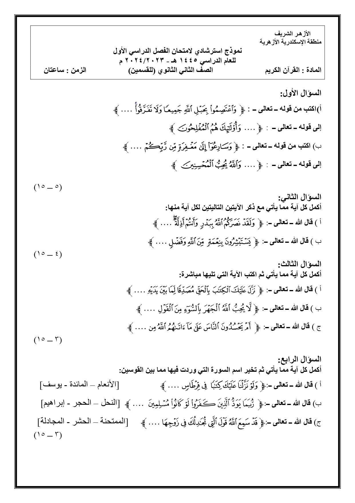 امتحانات قرآن الصف الثاني الثانوي الترم الأول