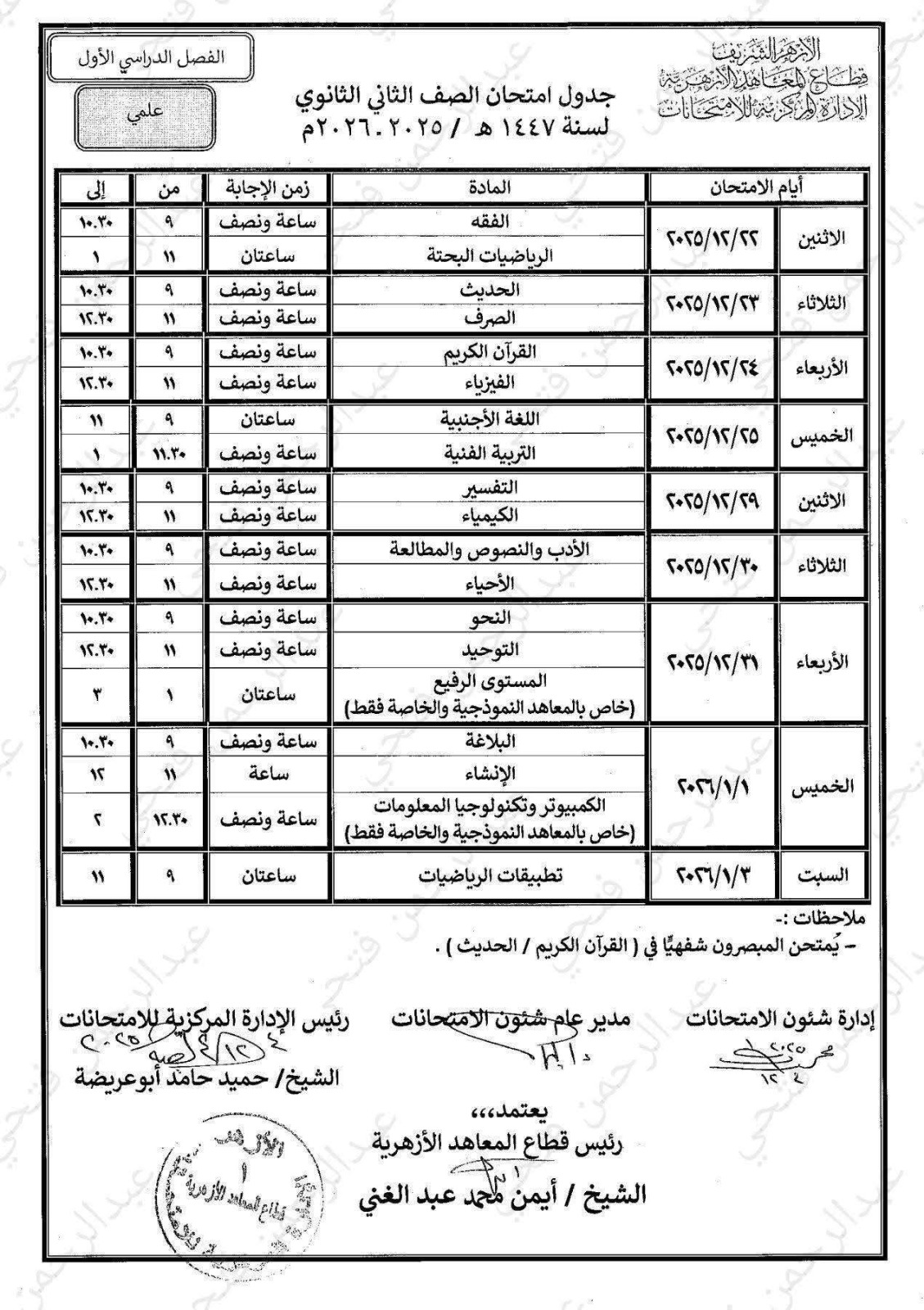 جدول امتحانات الصف الثاني الثانوي الأزهري 2026- 2025 علمي