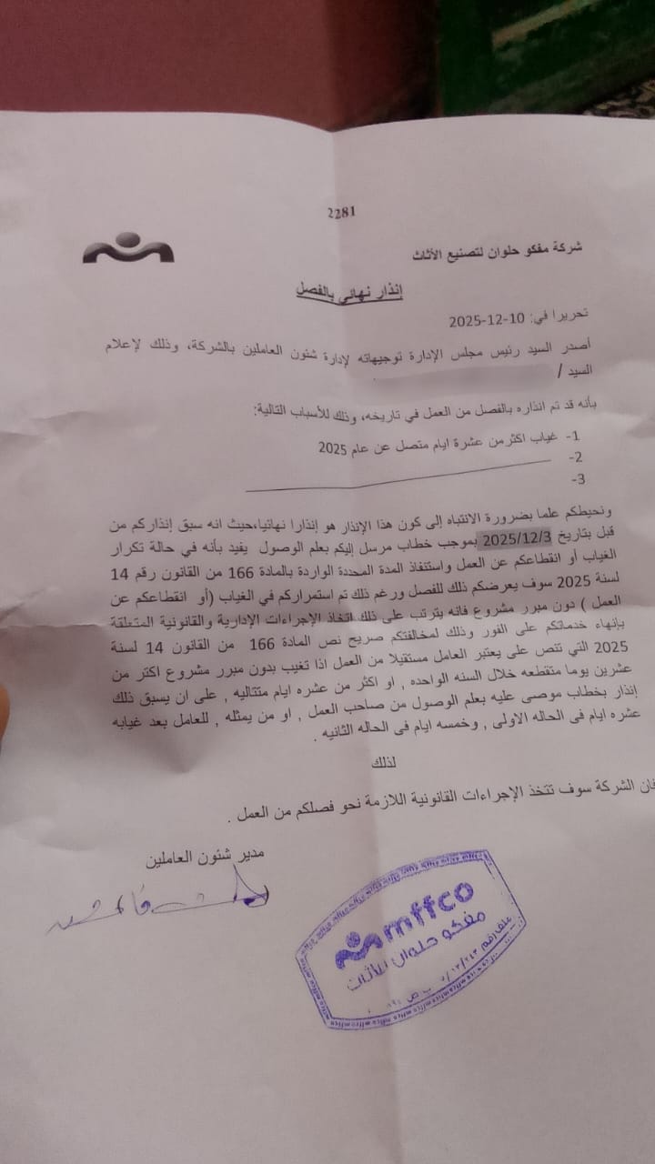 رد حكومي من وزارة العمل على أزمة مفكو حلوان