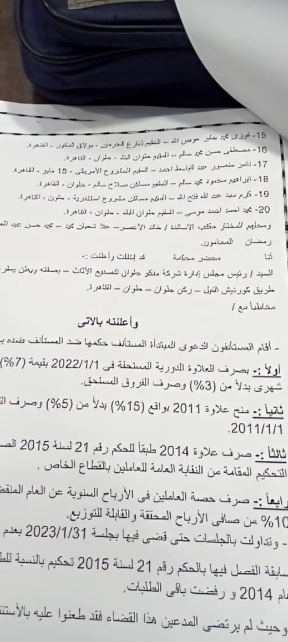 محامي العمال، خالد الأعصر، يؤكد رفع مئات القضايا للمطالبة بحقوق العاملين، مشيرًا إلى صدور أحكام بصرف ثلاث علاوات متأخرة عن أعوام 2011 و2014 و2022، إلى جانب أرباح مستحقة.