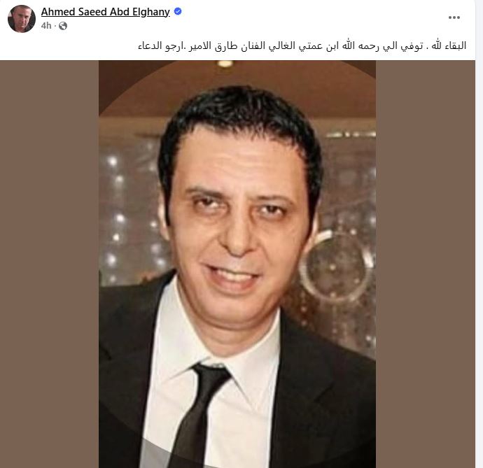 ونشر أحمد سعيد عبد الغني، صورةً للفنان الراحل طارق الأمير، عبر حسابه الرسمي بموقع التواصل الاجتماعي "فيسبوك"، معلقًا: «البقاء لله.. توفى إلى رحمة الله ابن عمتي الغالي الفنان طارق الأمير.. أرجو الدعاء".