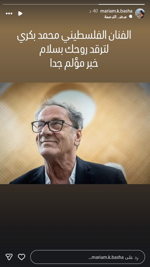ونشرت الفنانة الفلسطينية مريم كمال الباشا، صورة للمخرج الراحل عبر حسابها الرسمي بمنصة “إنستجرام” معلقة عليها: “الفنان الفلسطيني محمد بكري، لترقد روحك بسلام.. خبر مؤلم جدًا”.