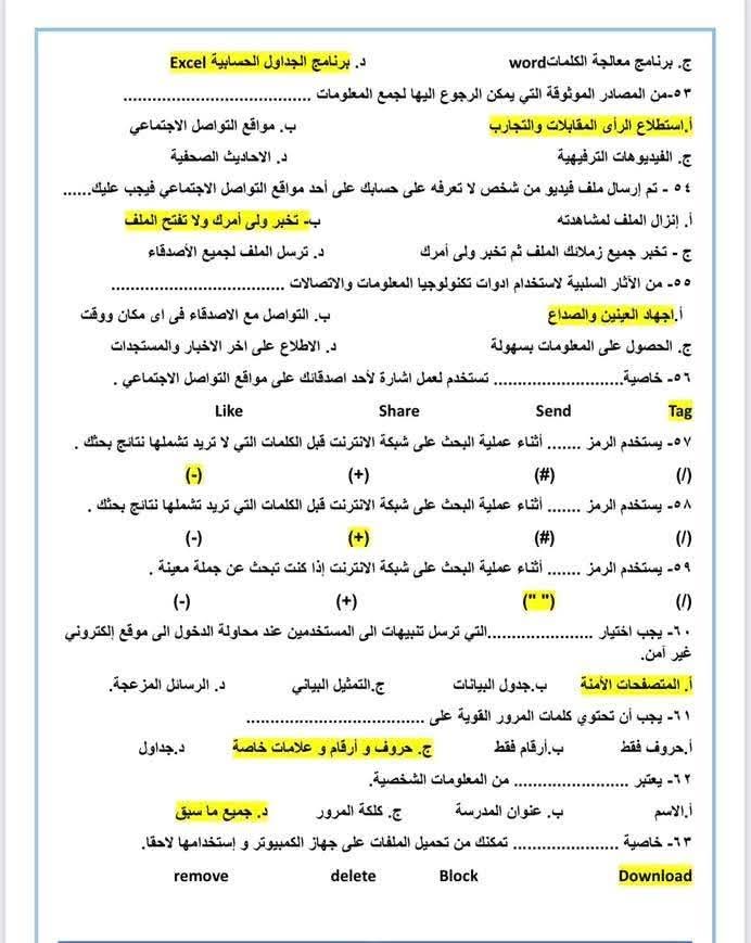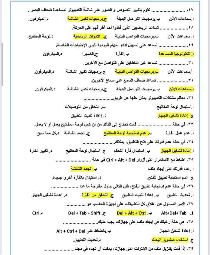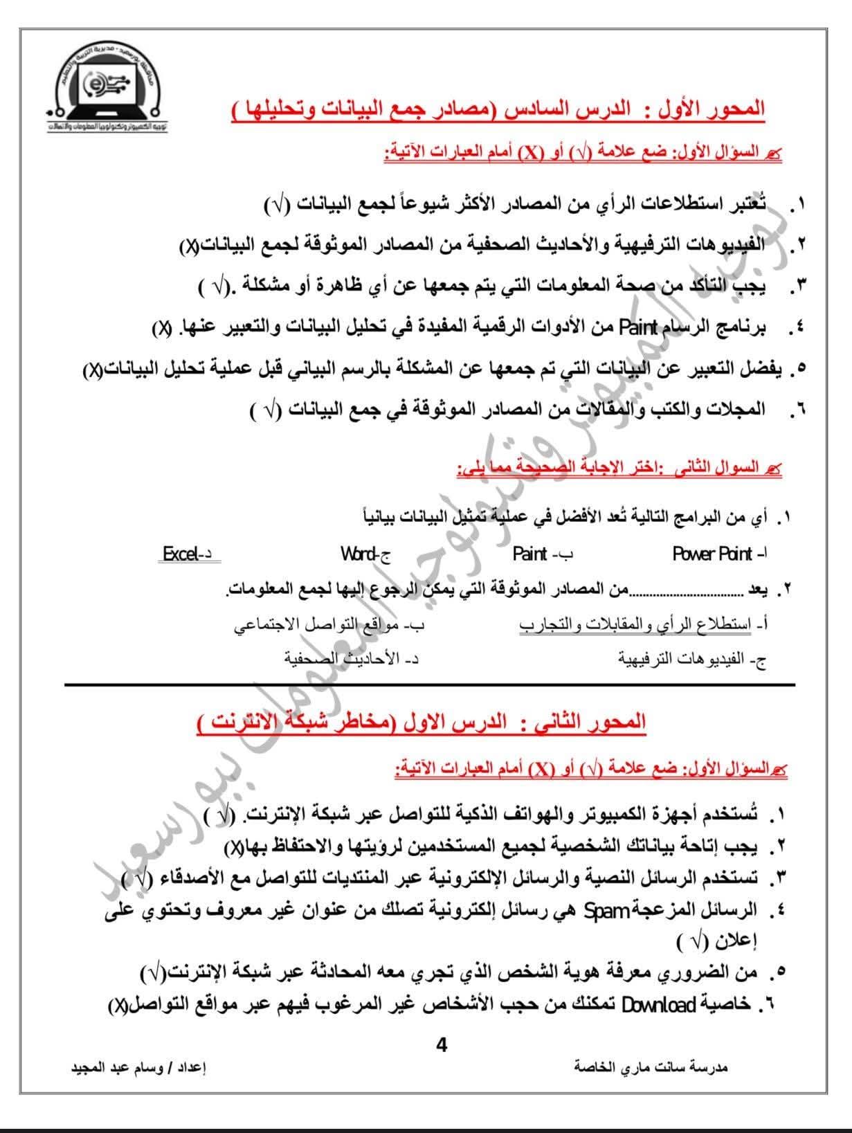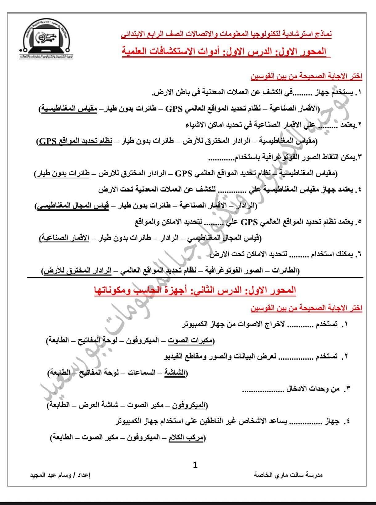 مراجعة تكنولوجيا المعلومات والاتصالات للصف الرابع الابتدائي، أهم الأسئلة