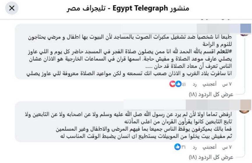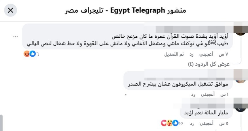 وجاء تعليق أحد المتابعين على صفحة “تليجراف مصر” على فيسبوك، بأنه مؤيد بشدة أن يذاع صوت القرآن بصوت مرتفع عبر مكبرات الصوت، قائلاً: "صوت القرآن عمره ما كان مزعج".